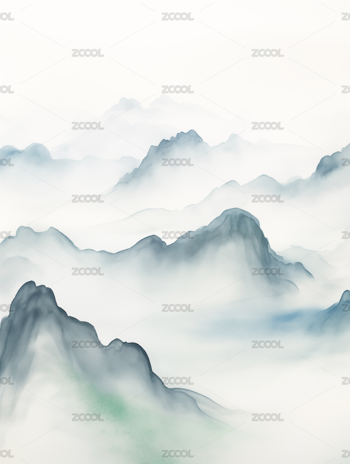 国风水彩画山峰梦幻柔和极简抽象蓝绿色