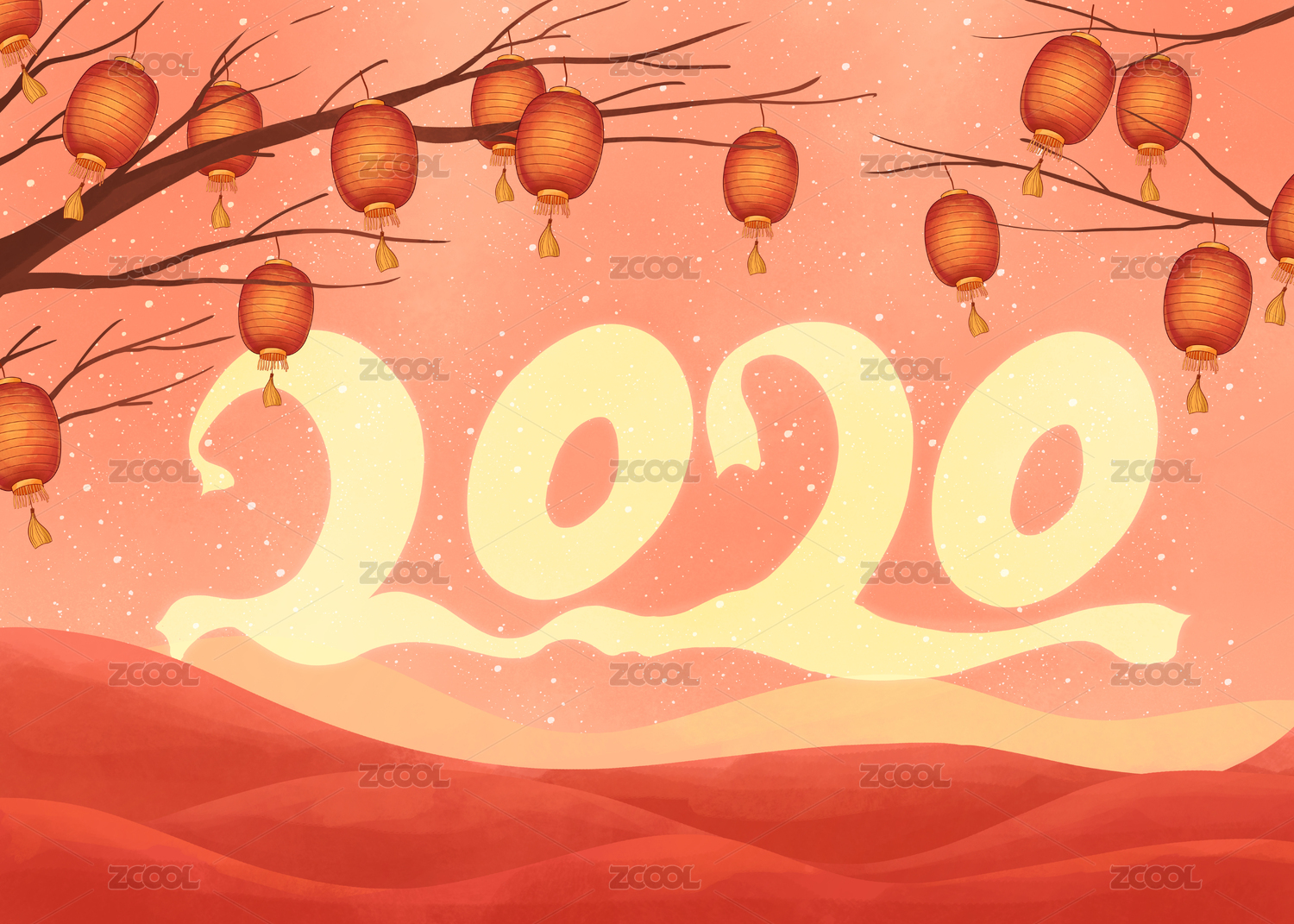 挂满灯笼的树枝后2020红色字形新年插画横版