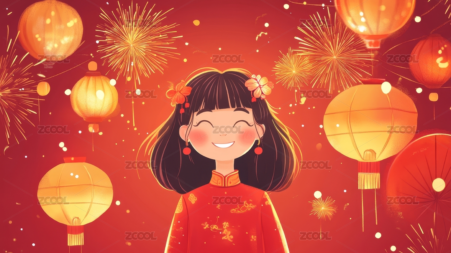 挂满灯笼的树枝下手拿福字灯笼的儿童新年插画横版