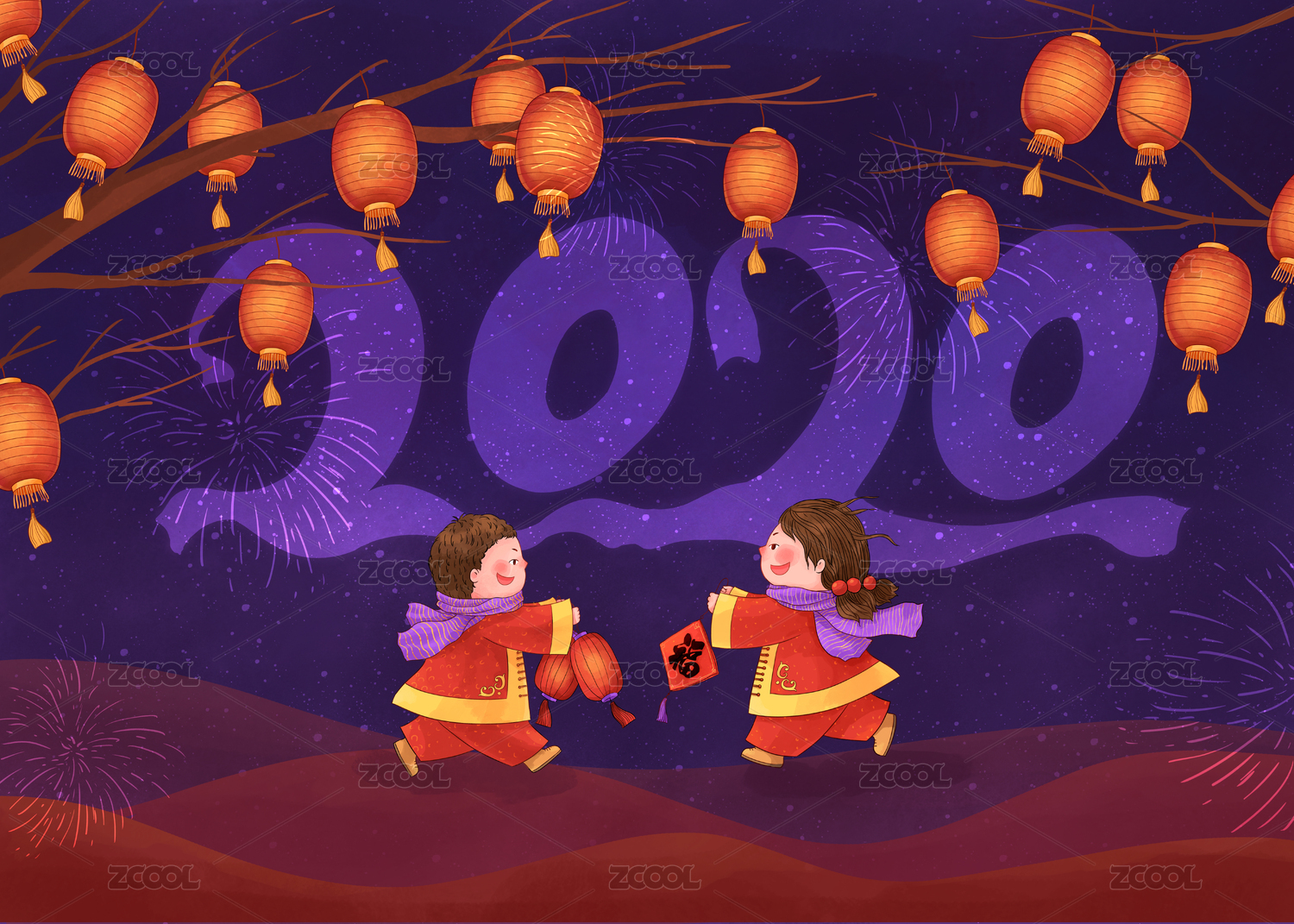 2020金色字形与手拿灯笼福字的儿童新年插画夜晚