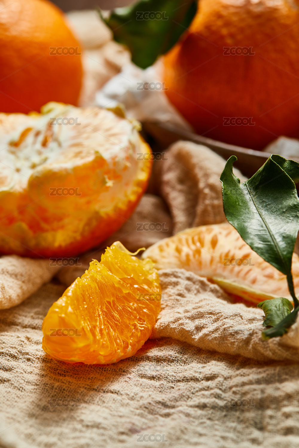 暗调静物摄影复古木质桌上剥开的黄色桔子