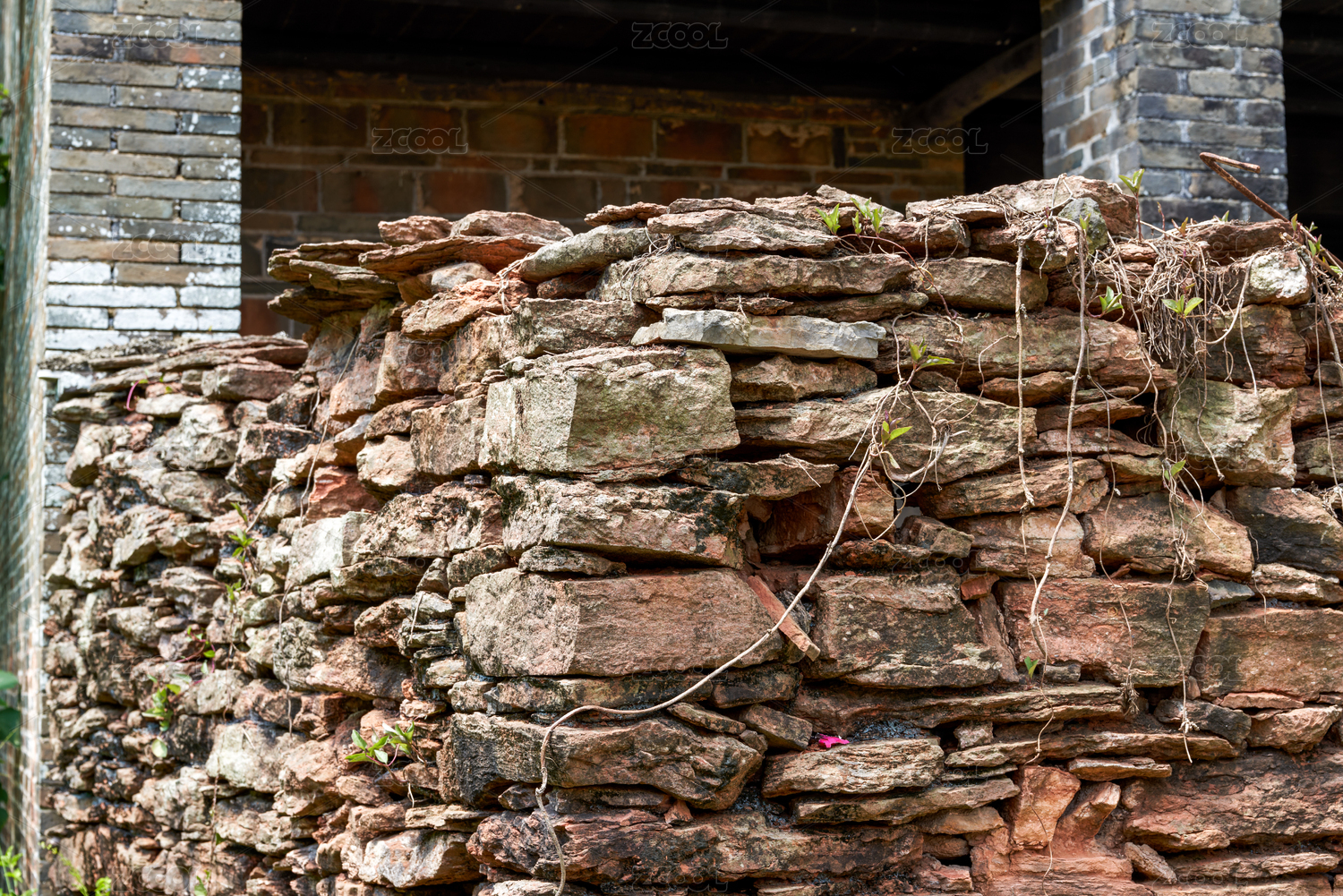 中国乡村古村落里的石头砌墙特写