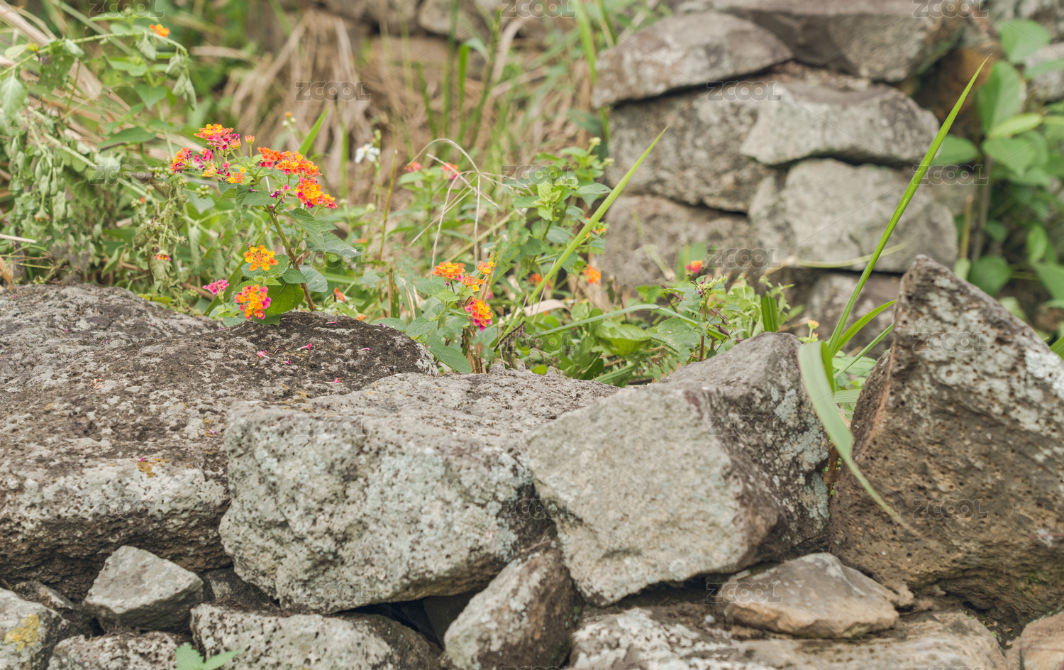 中国传统村落海南石石矍村火山岩石墙与小花