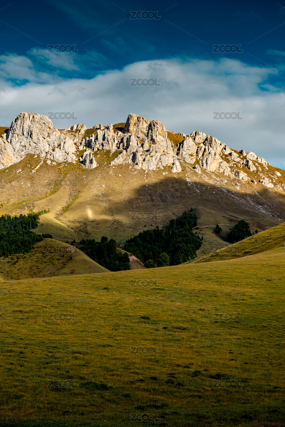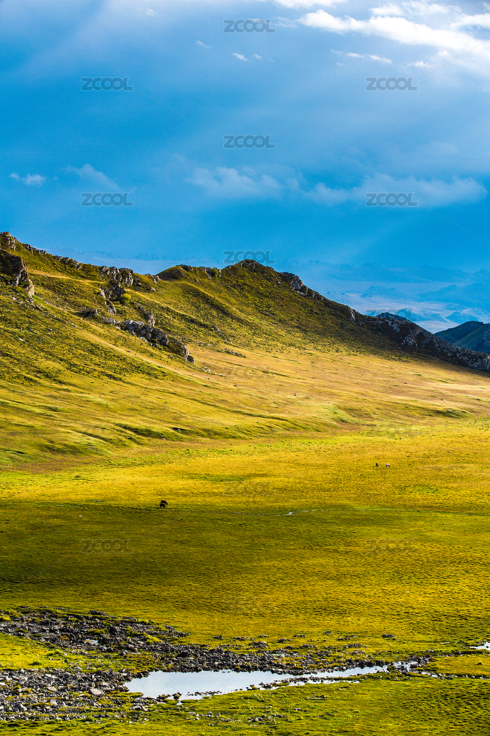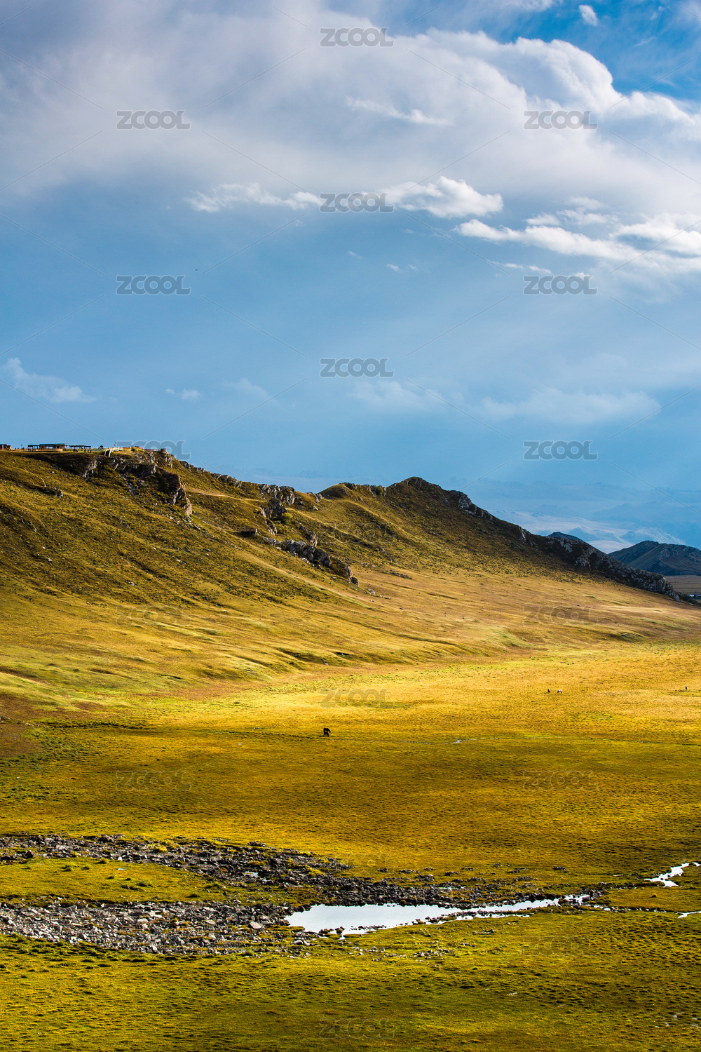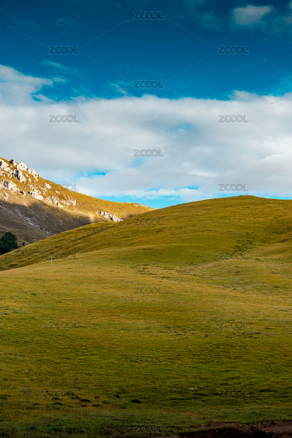 中国四川甘孜藏族自治州蓝天白云下的草原山