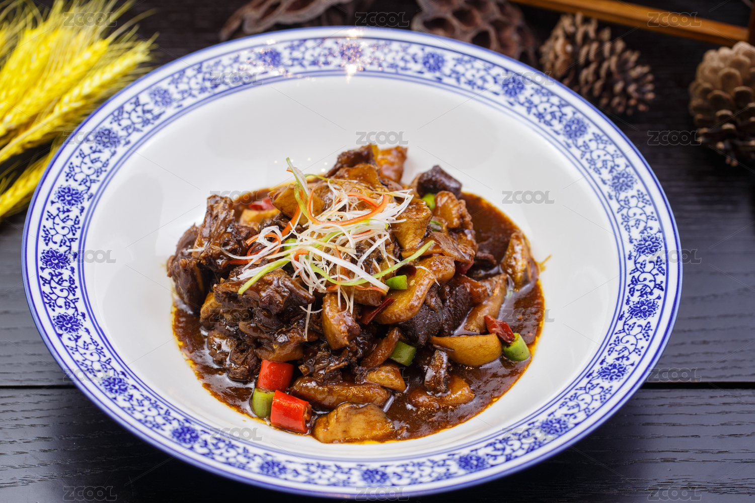青花瓷盘装的红烧土鸡块