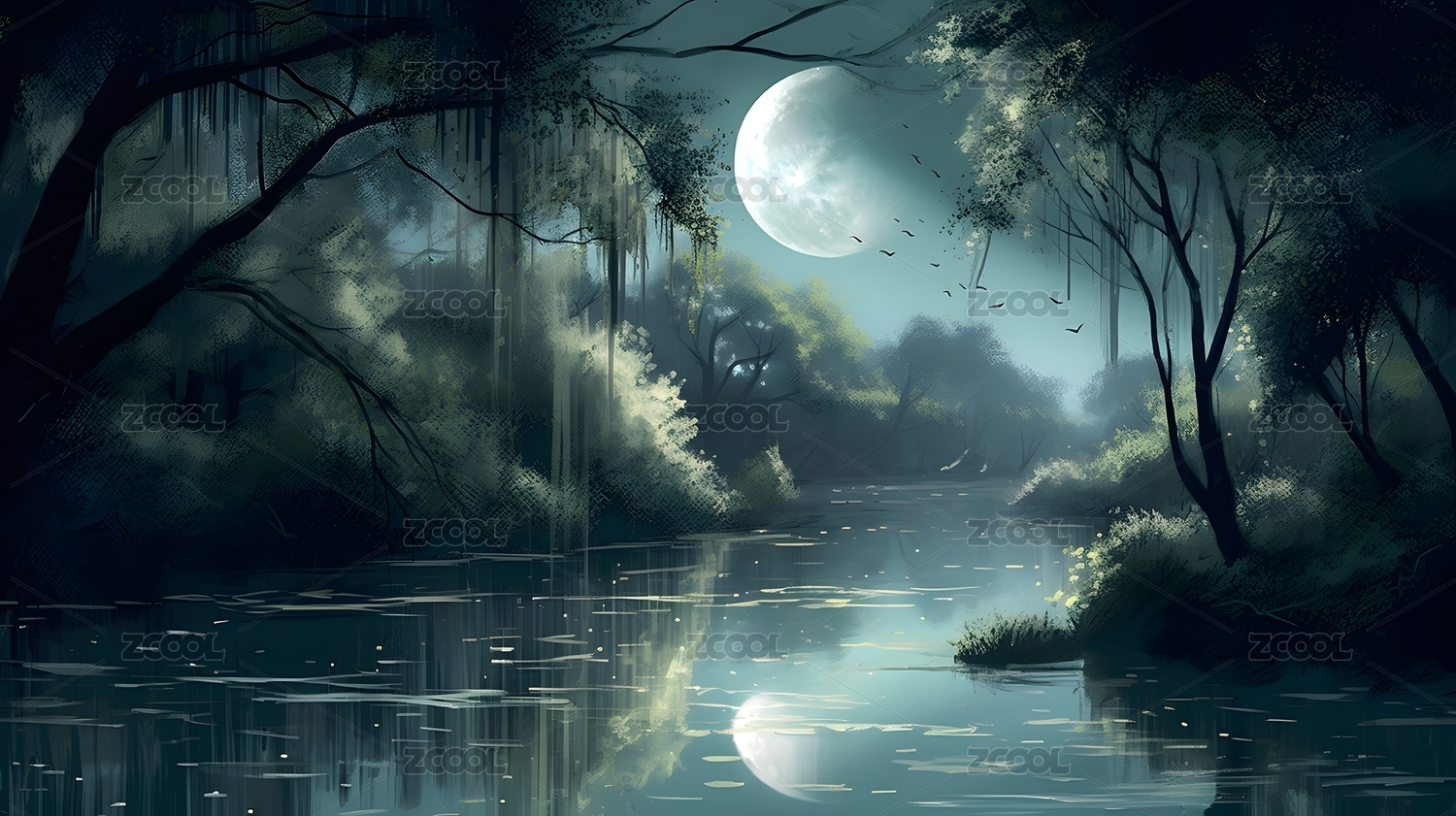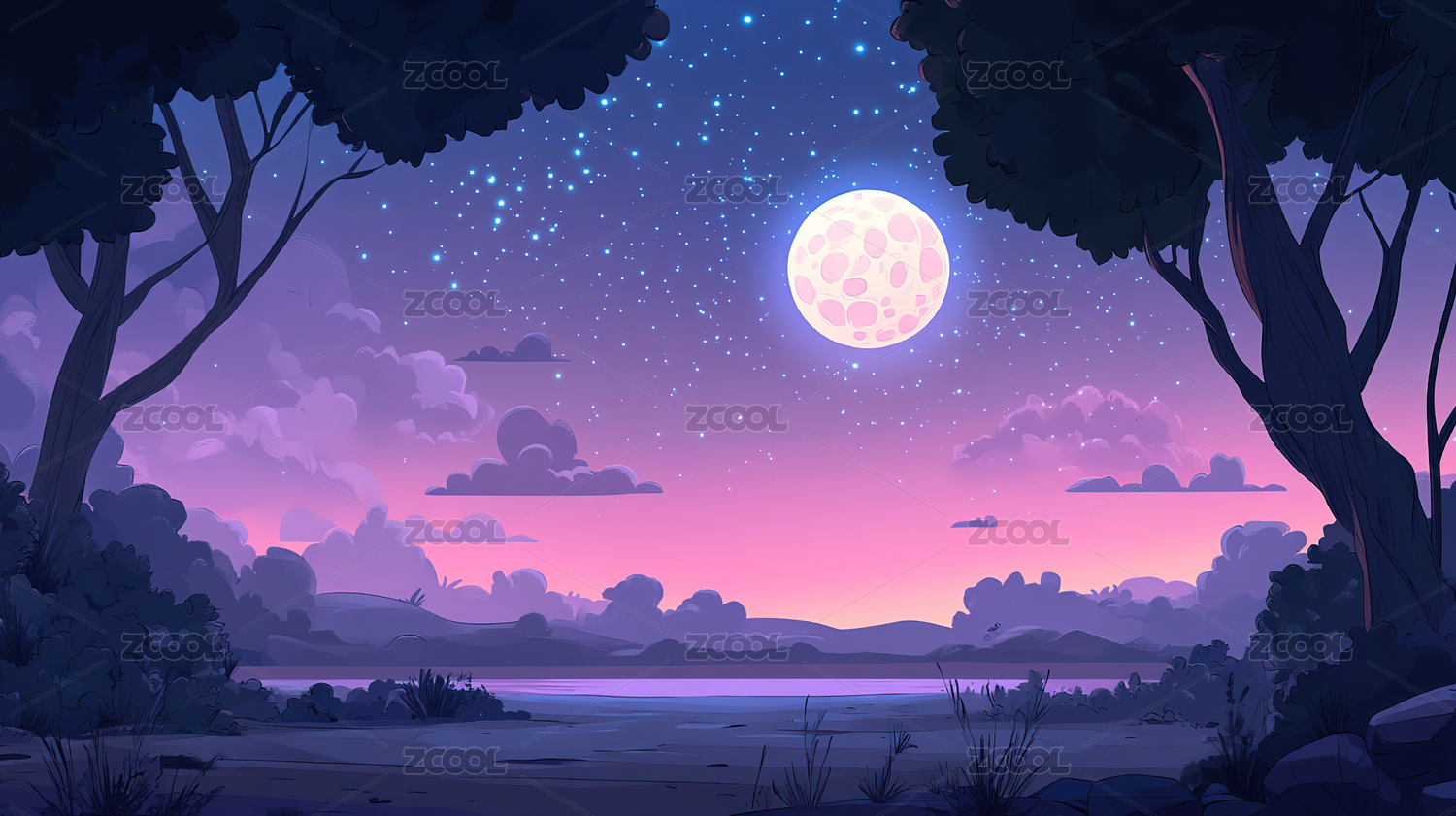 黑色夜晚河边月亮升起的梦幻场景