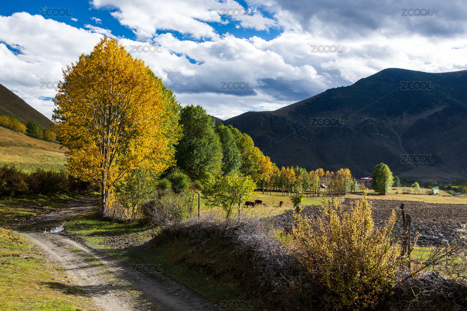 秋天,秋季,秋色,户外,甘孜州,新都桥,云雾,树,村庄,藏区