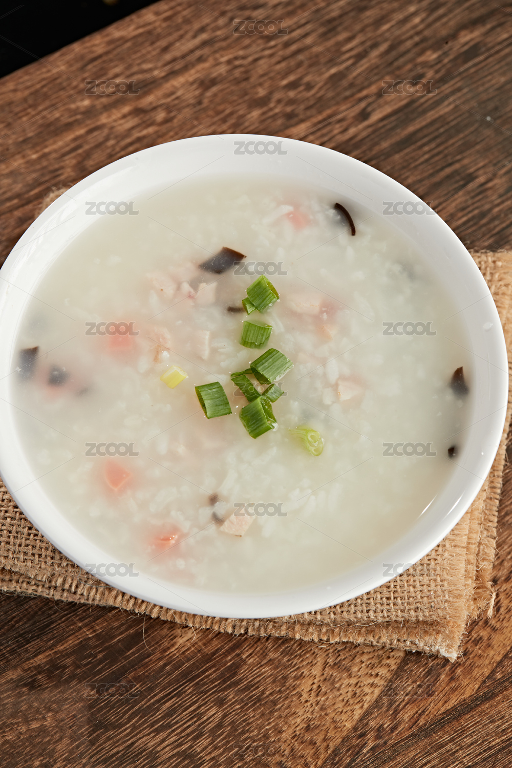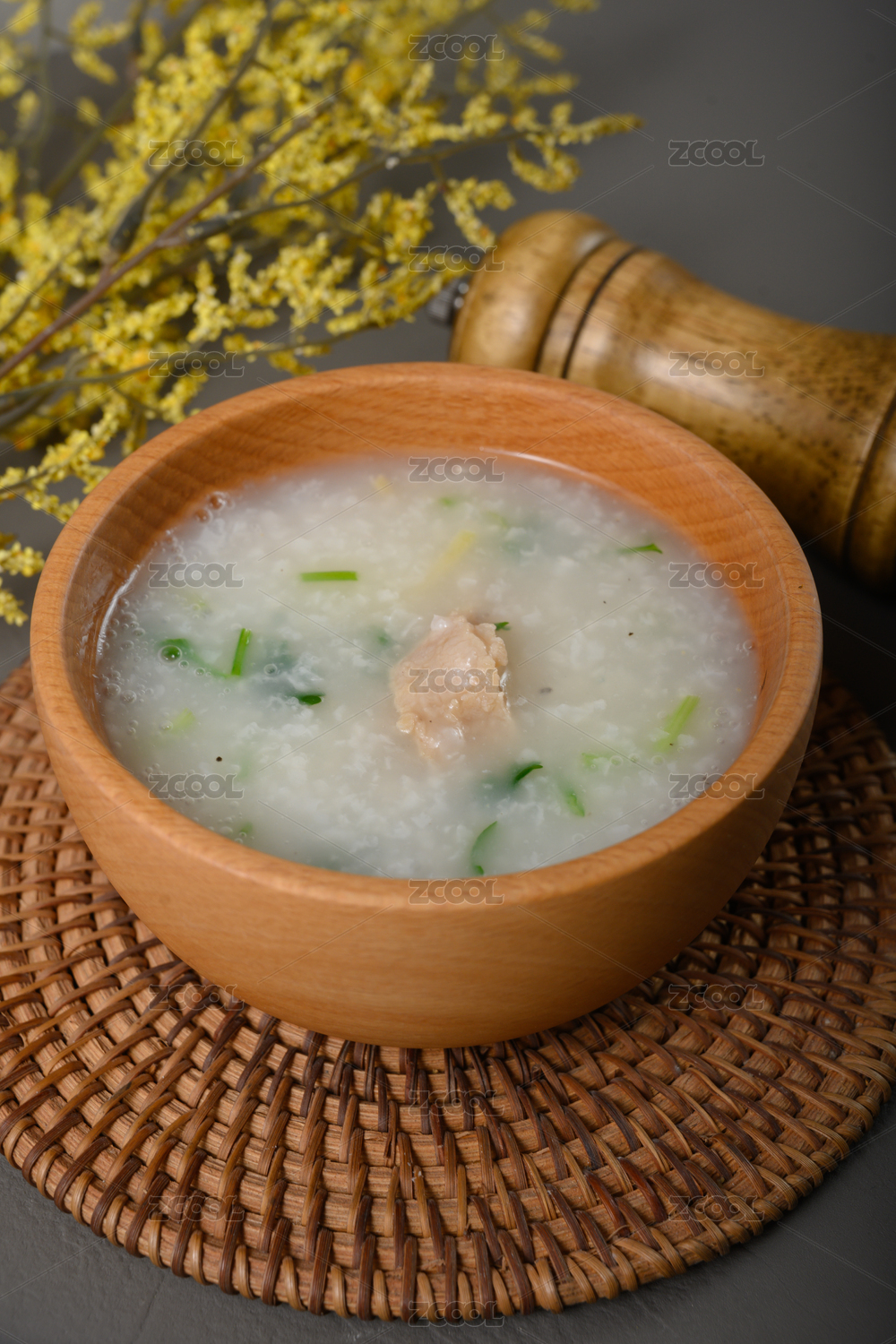 桌面上的碗里的美味可口的猪肉粥