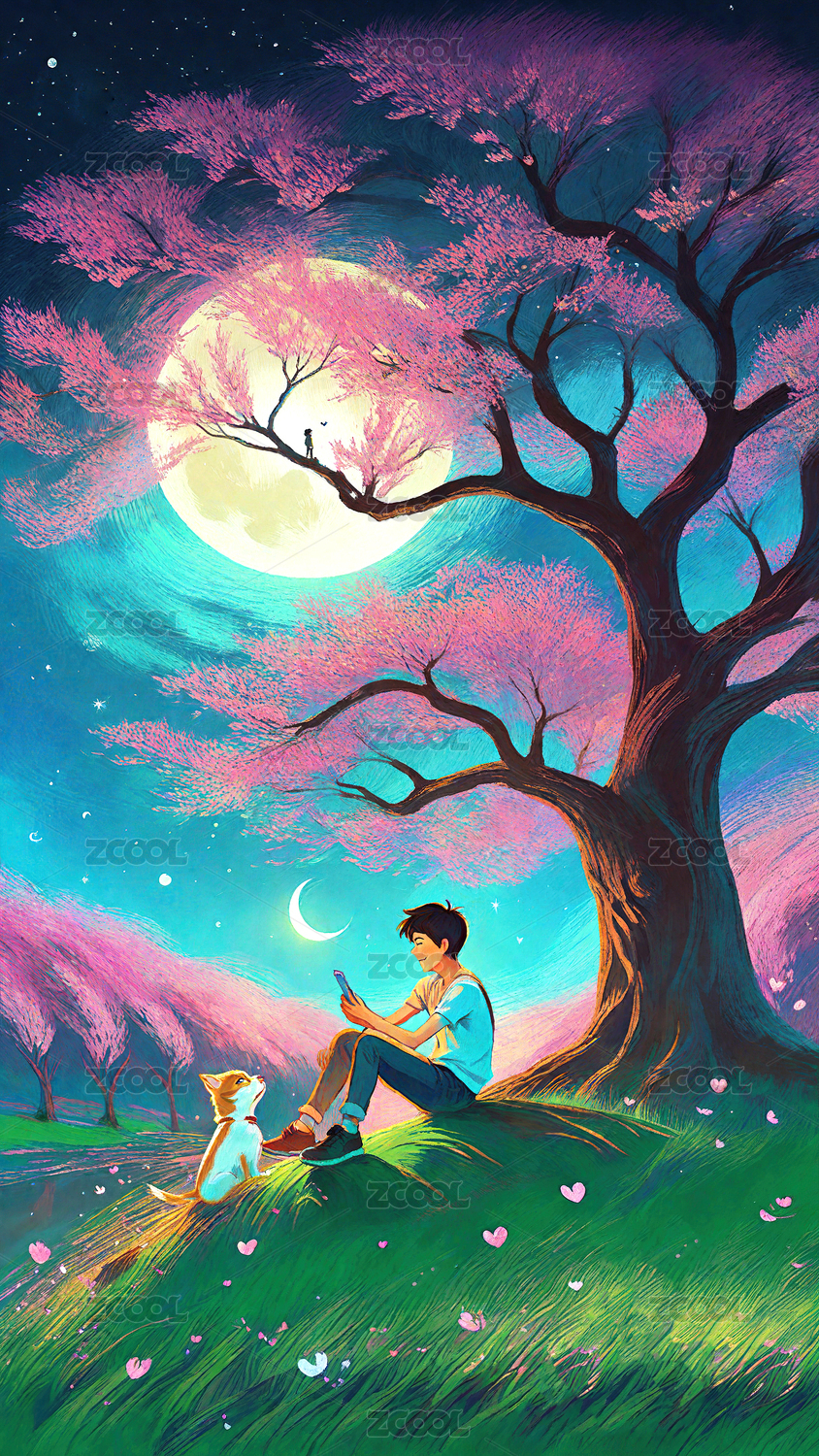 傍晚夕阳的公园树林里看书女孩和狗的插画