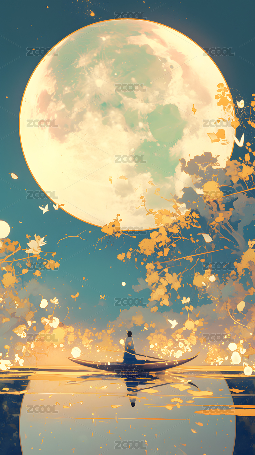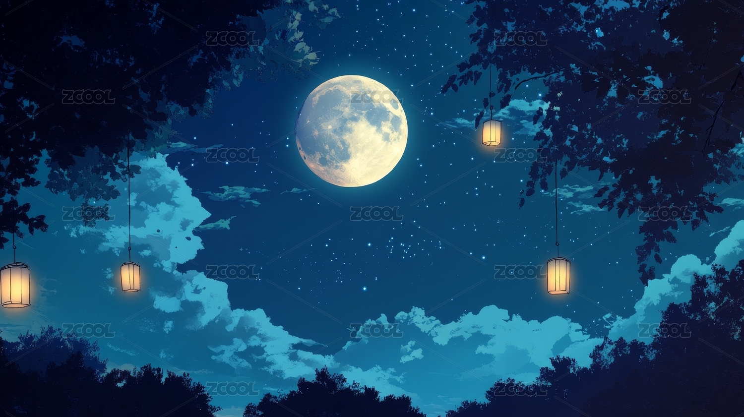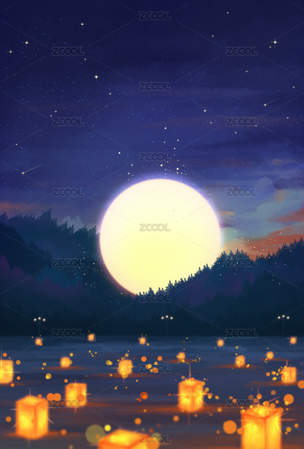 插画,夜晚,月亮,路灯,明亮,中秋,端午,海报,照明