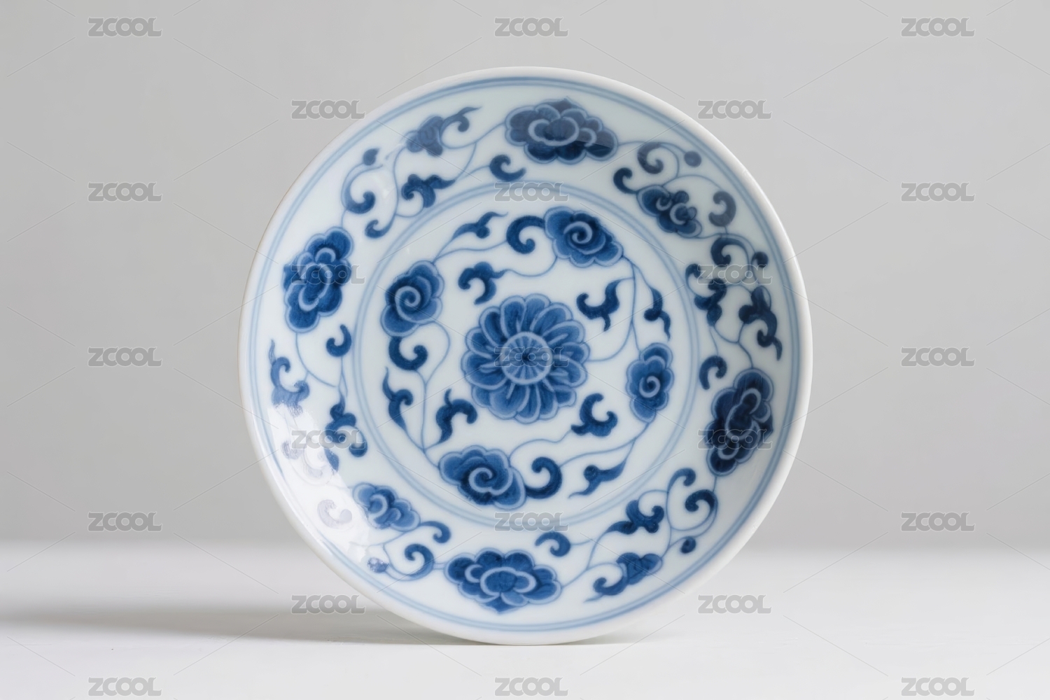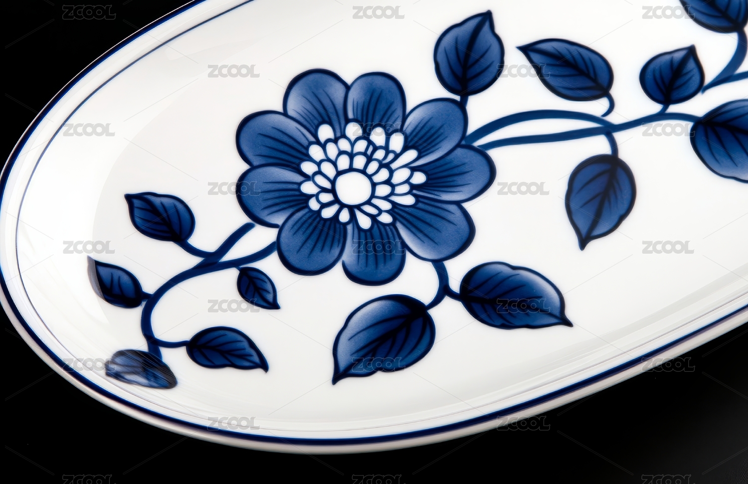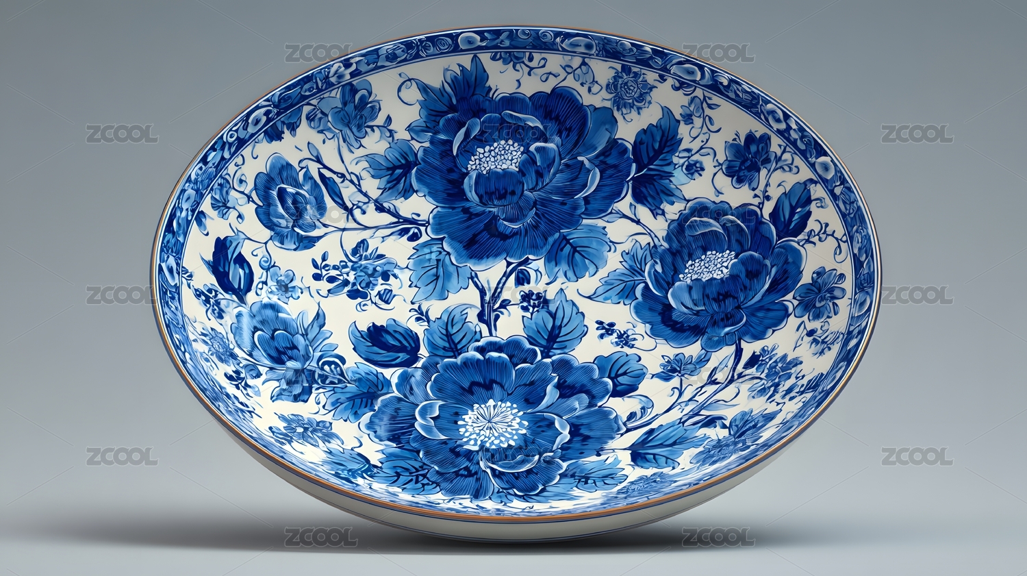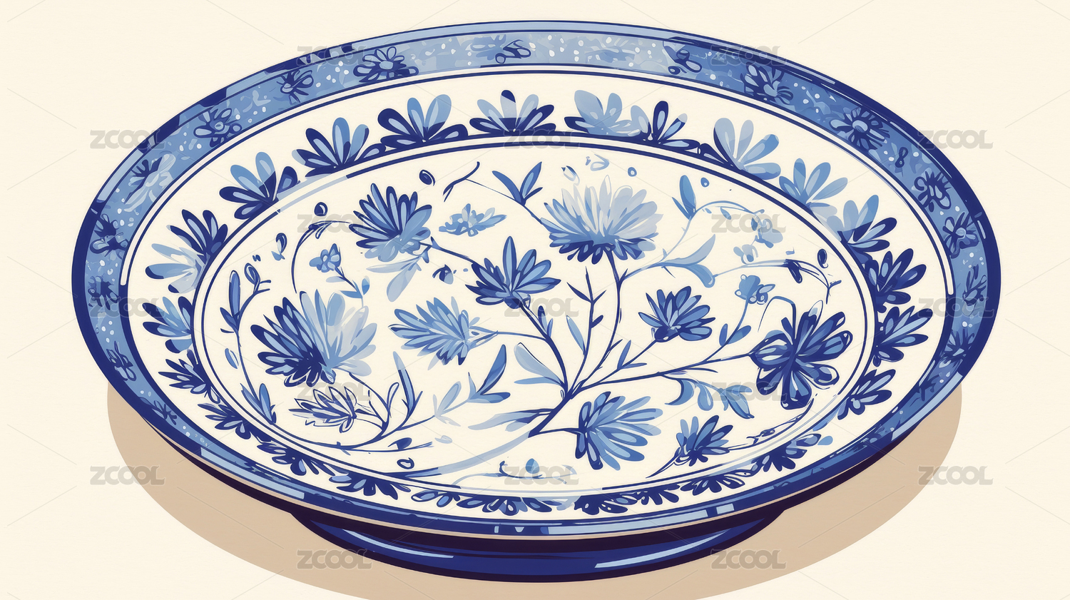 青花瓷盘盛开蓝色花朵