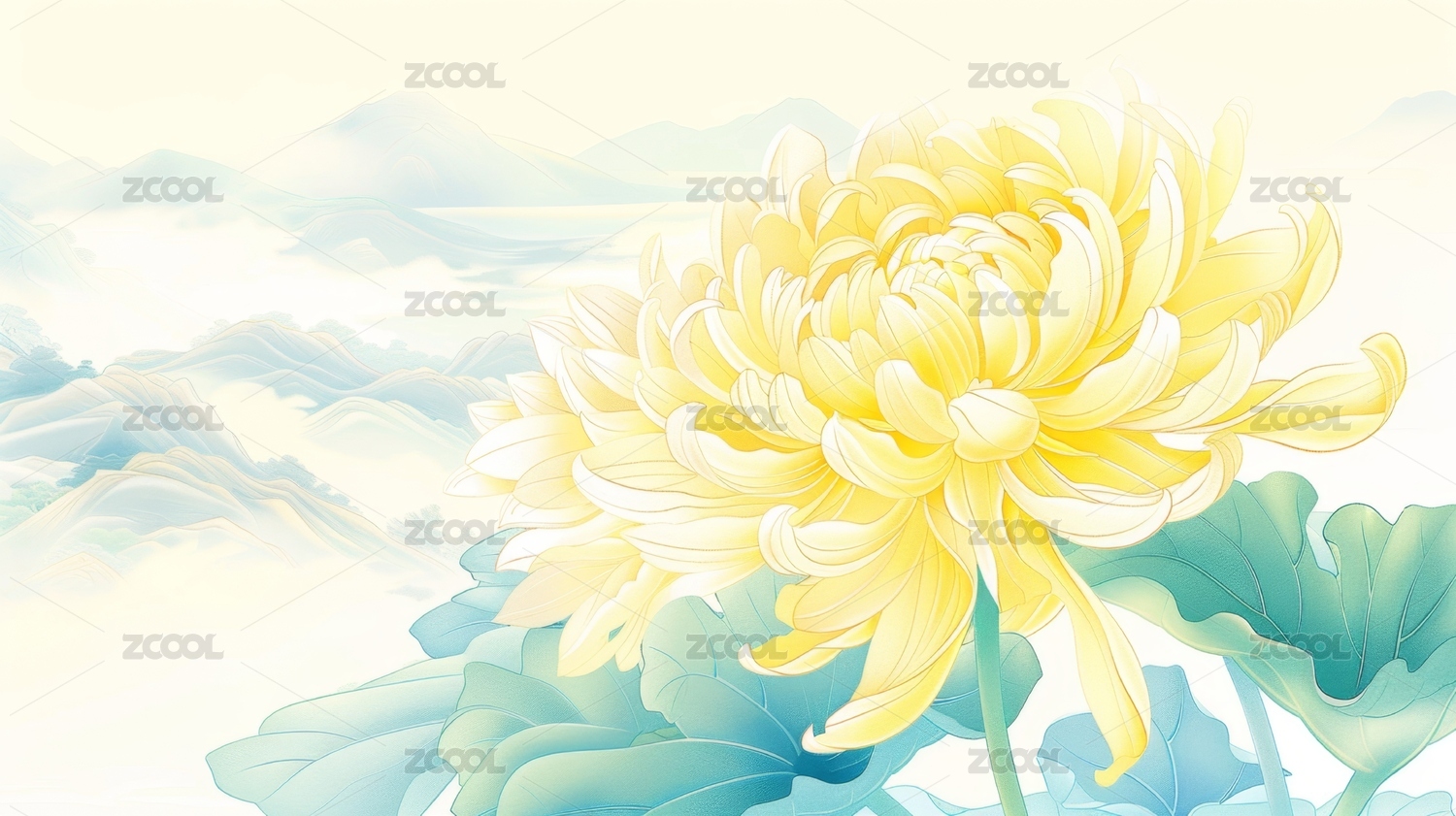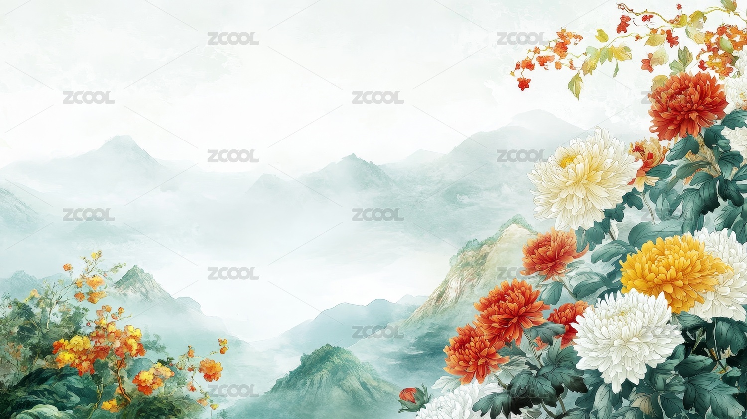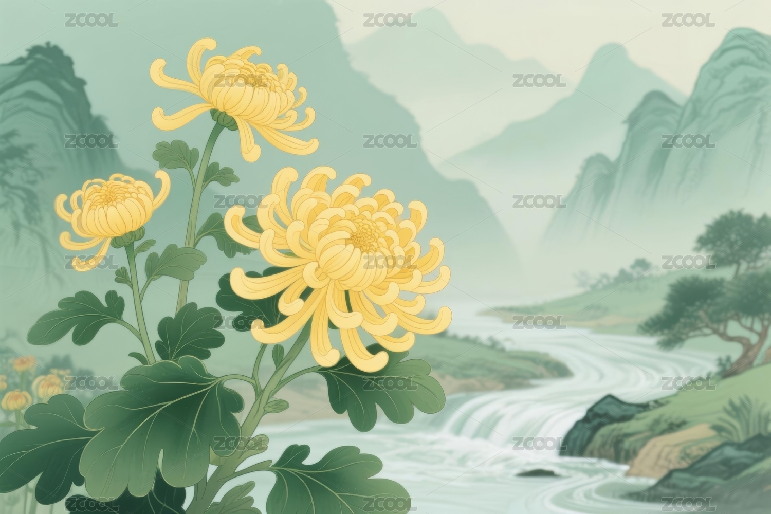 菊花,山水,山脉,花卉,高山,远山,插画,中国风,重阳节,节日