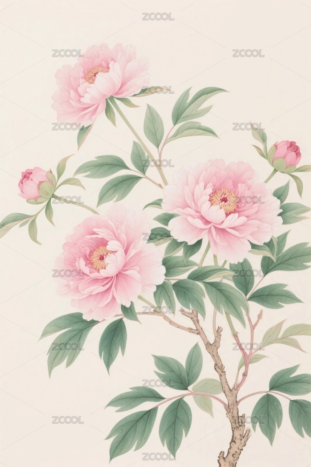 国潮牡丹花,中国风工笔画牡丹花卉插画