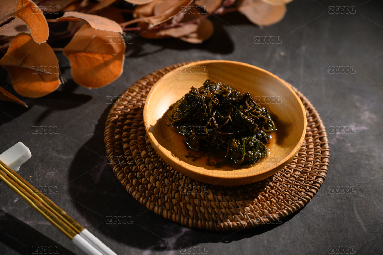 桌面上的盘子里的美味可口的凉拌苏子叶