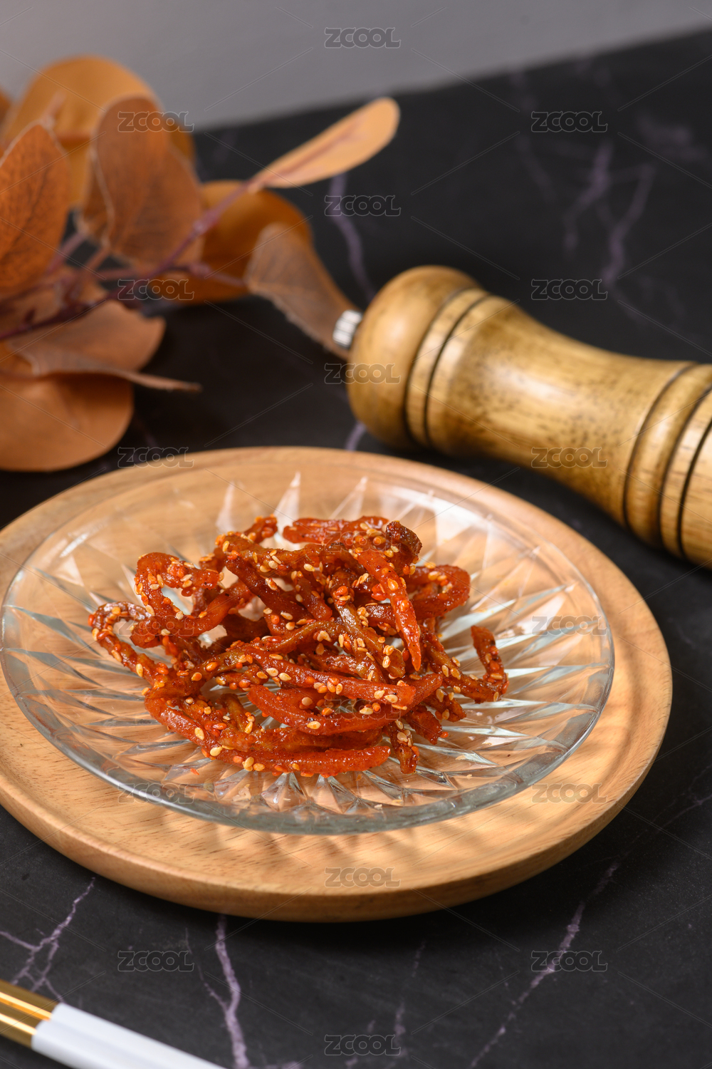 桌面上盘子里的美味可口的麻辣鳗鱼丝