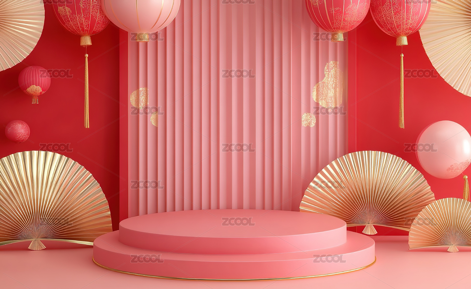 红色舞台蓝墙灯笼扇子装饰