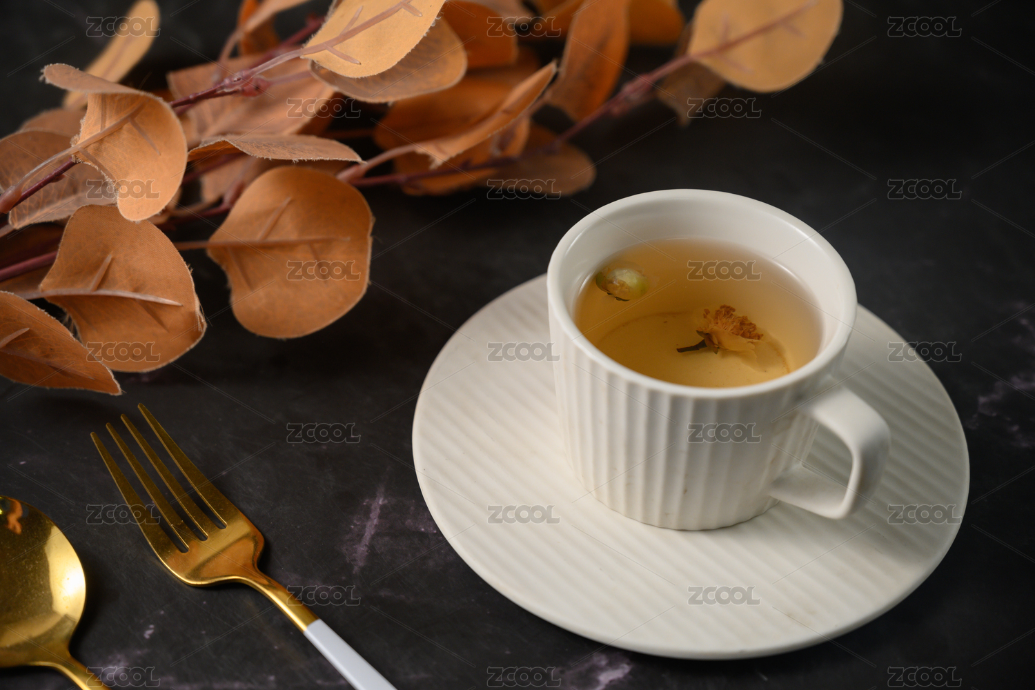 桌面上的杯子里的甘甜可口的金盏菊花茶