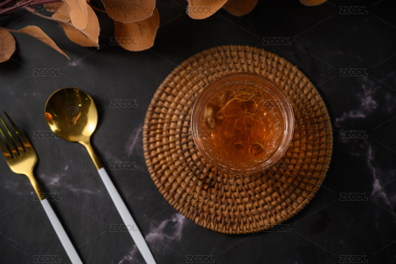 桌面上的杯子里的甘甜可口的金盏菊花茶