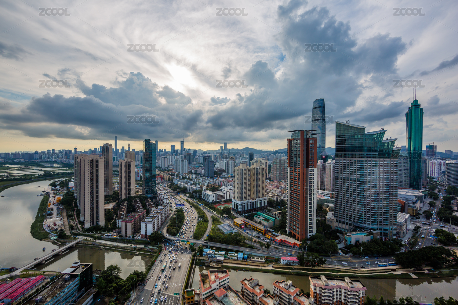 傍晚中国广东省深圳罗湖滨河路段天际线