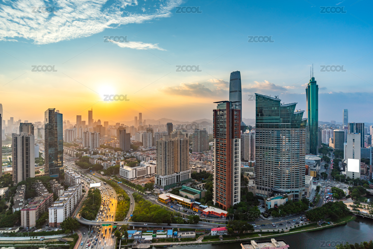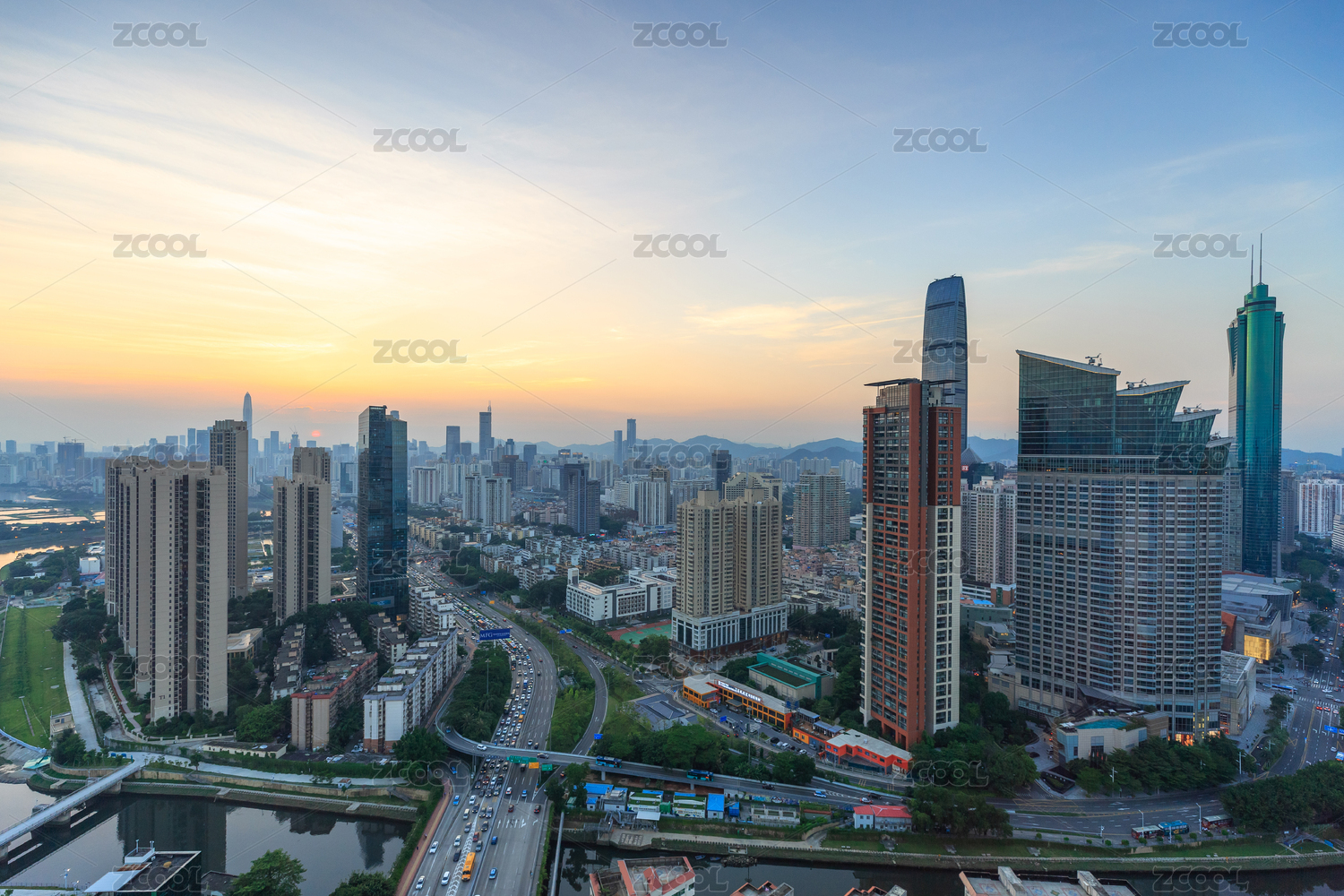 中国广东省深圳罗湖滨河路段傍晚天际线