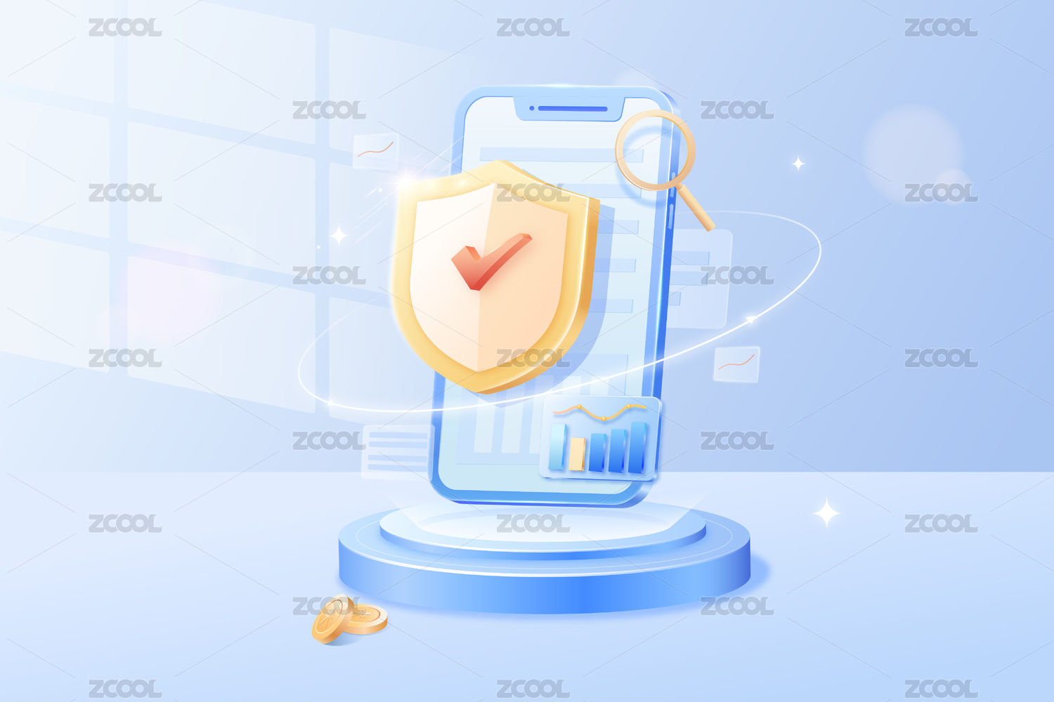 金融,数据,商务,柱状图,盾牌,放大镜,饼图,网络安全,保护,防护