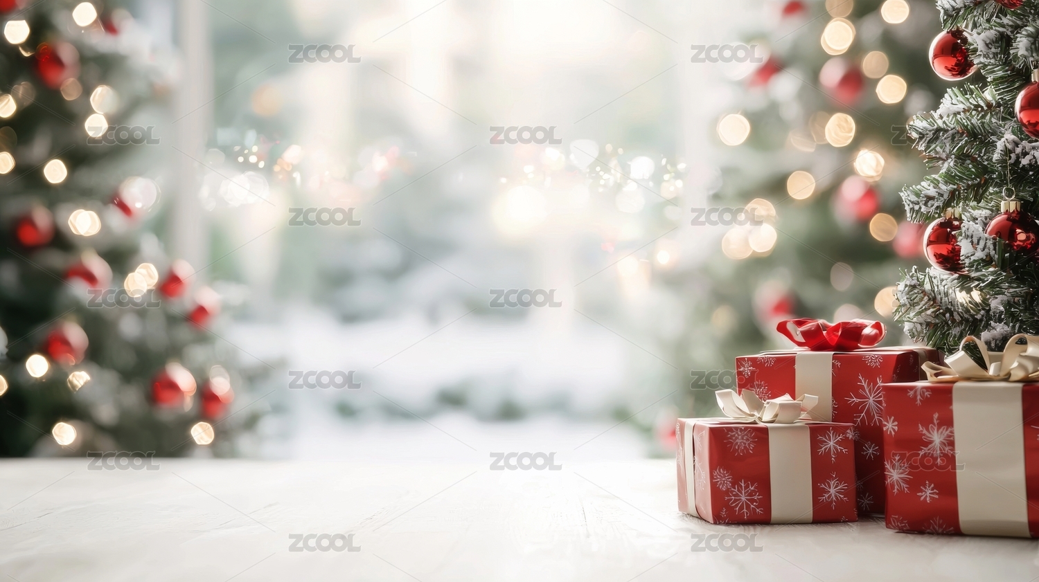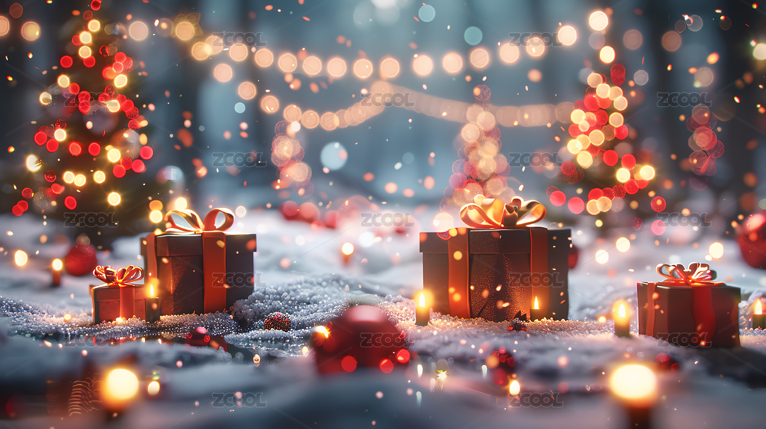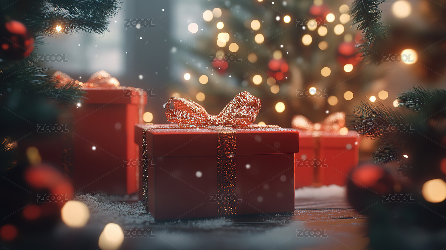 圣诞树下的红色礼物与灯光