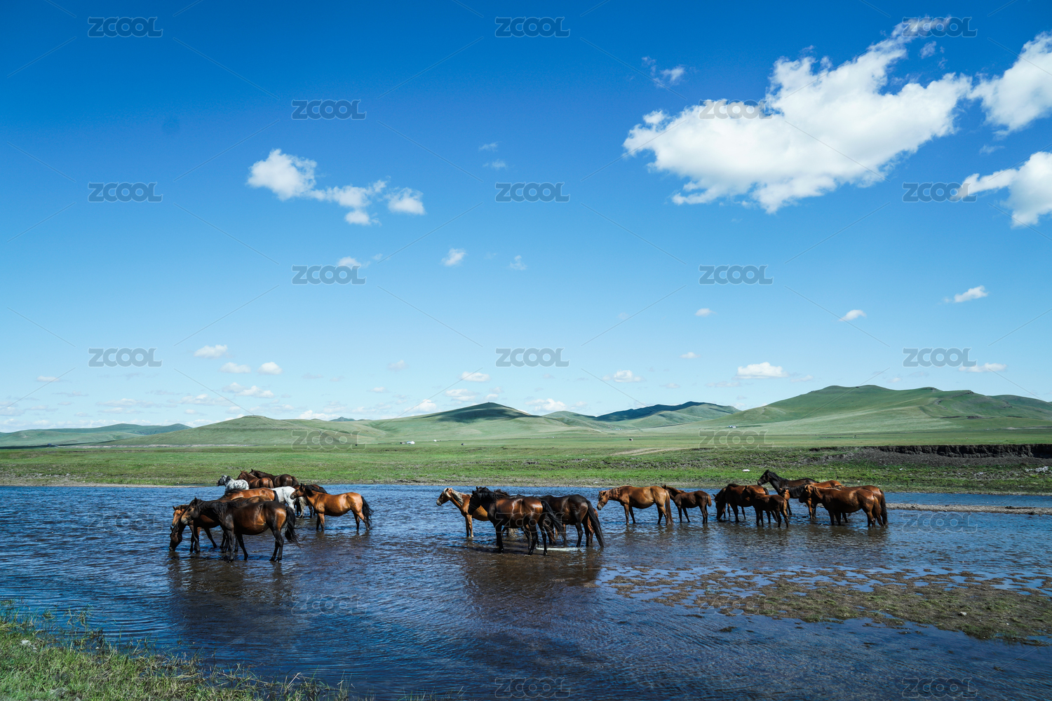 河北省沽源县库伦淖尔景区清晨的草原牧马