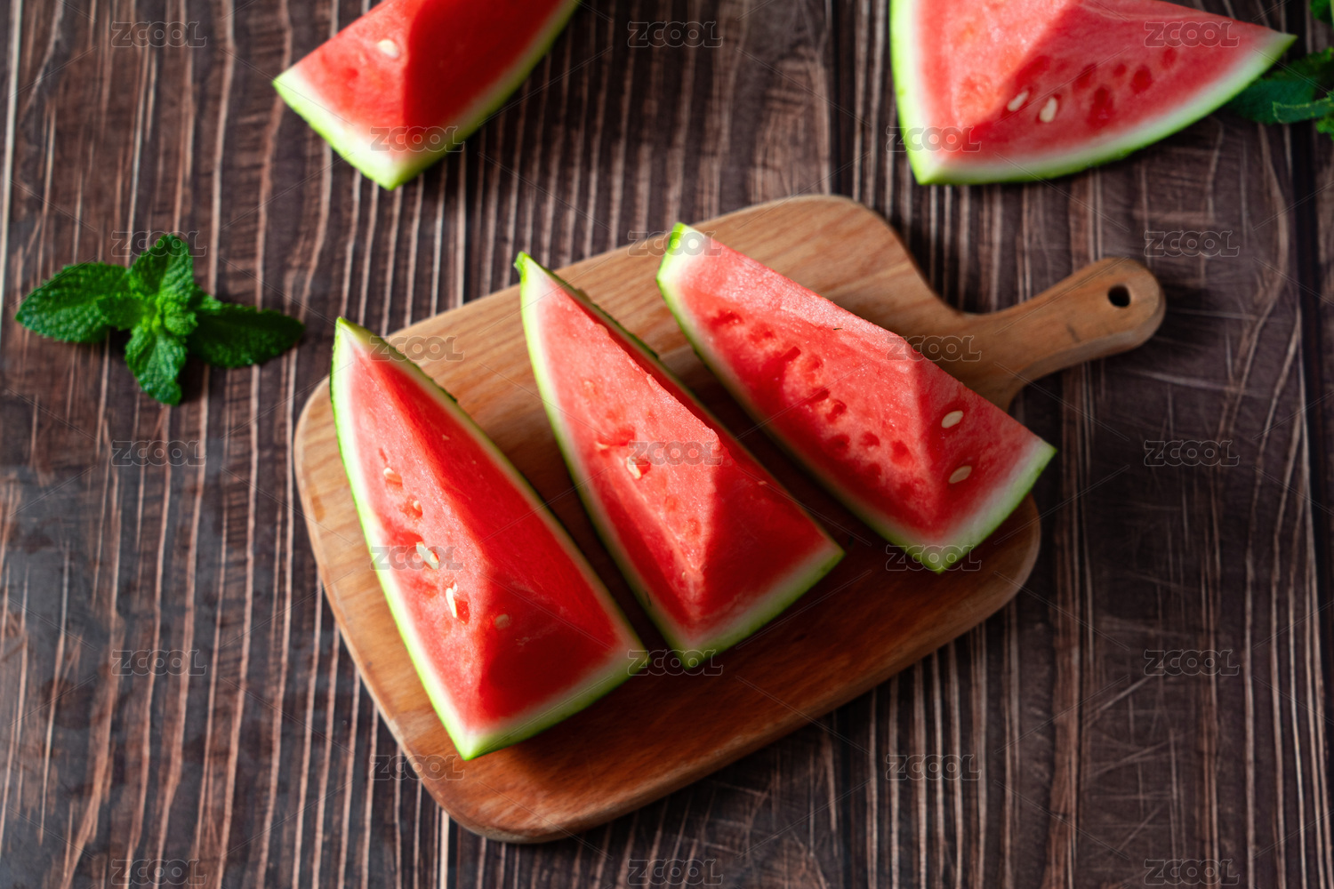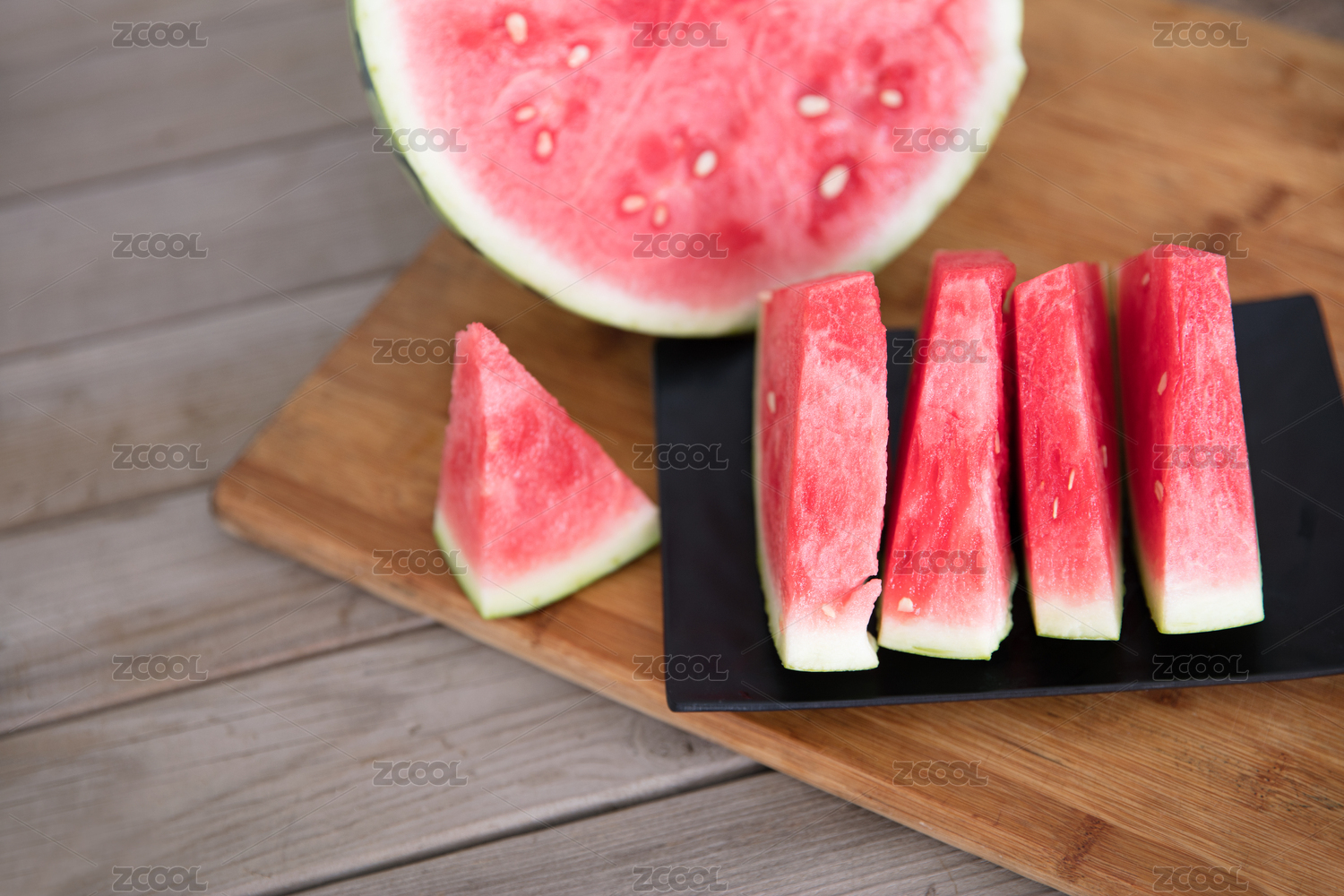 木制板背景前放着几片红色的西瓜
