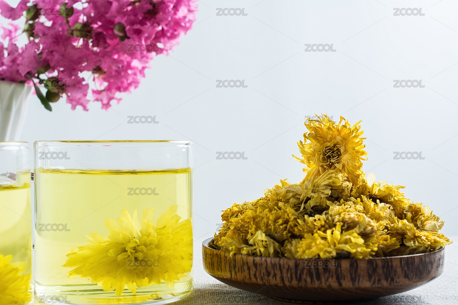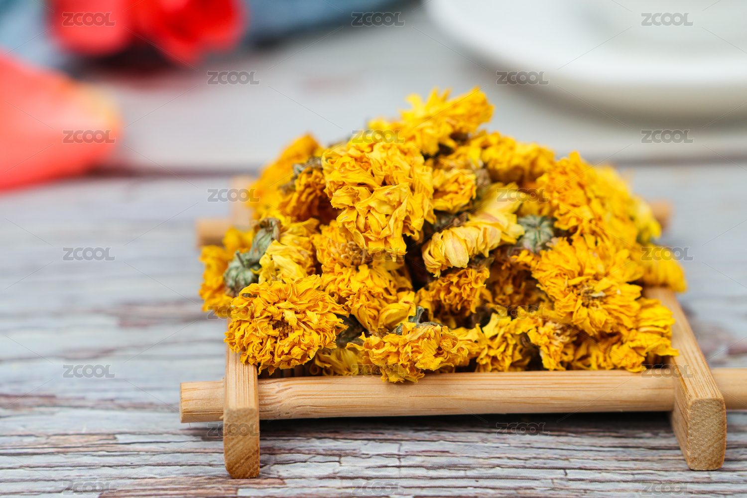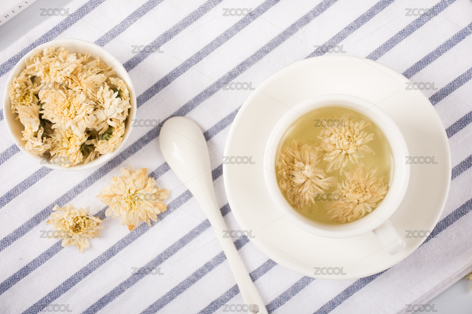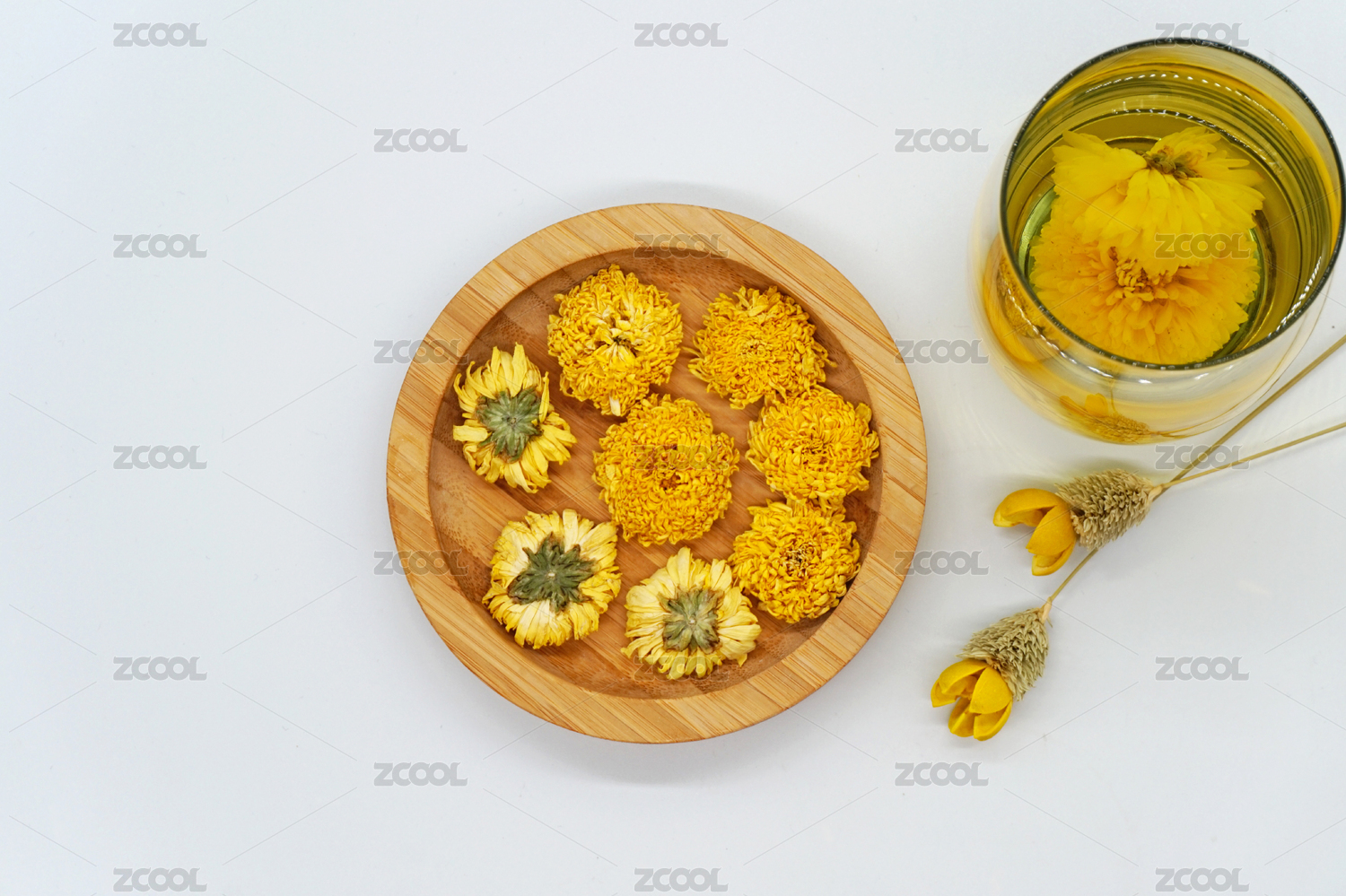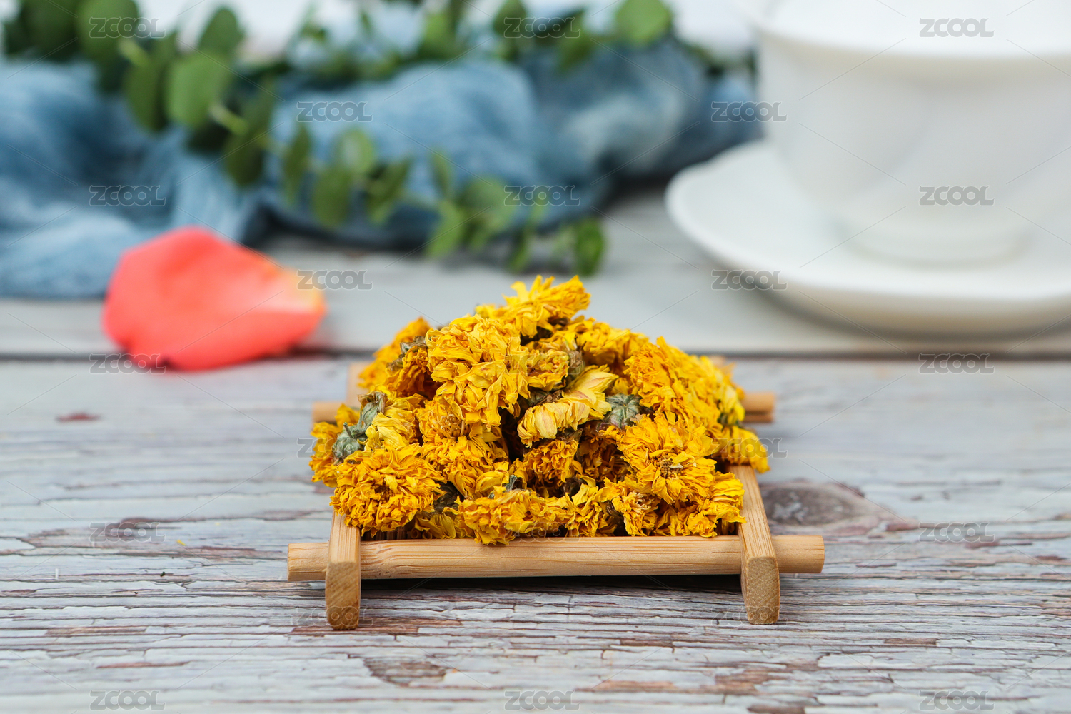 中国古典风格的杭白菊健康花茶与茶杯特写