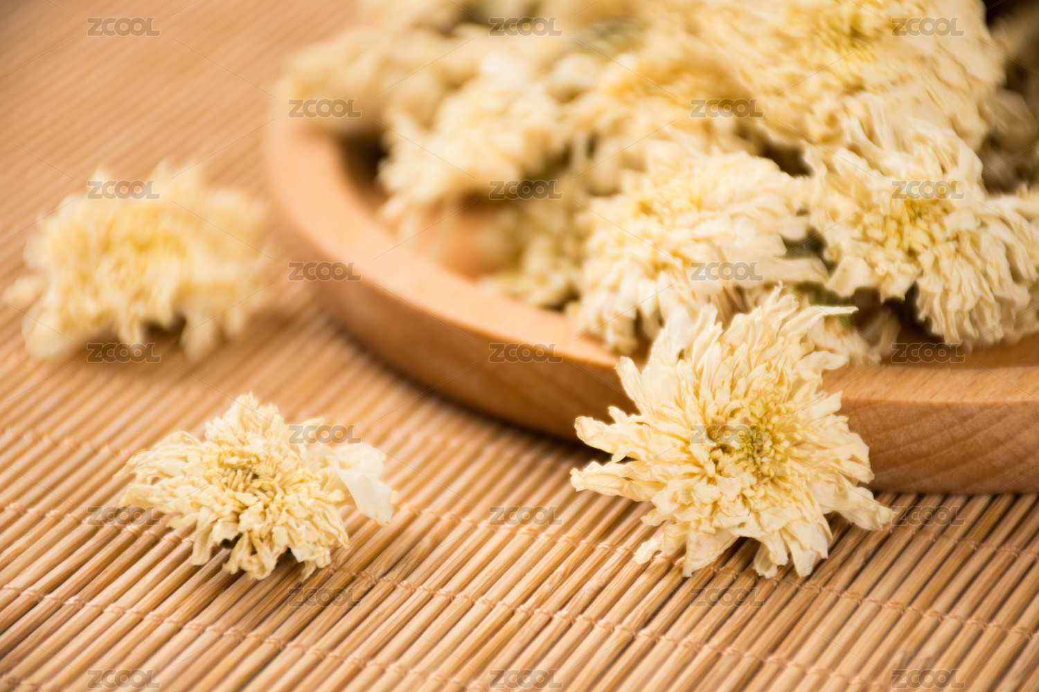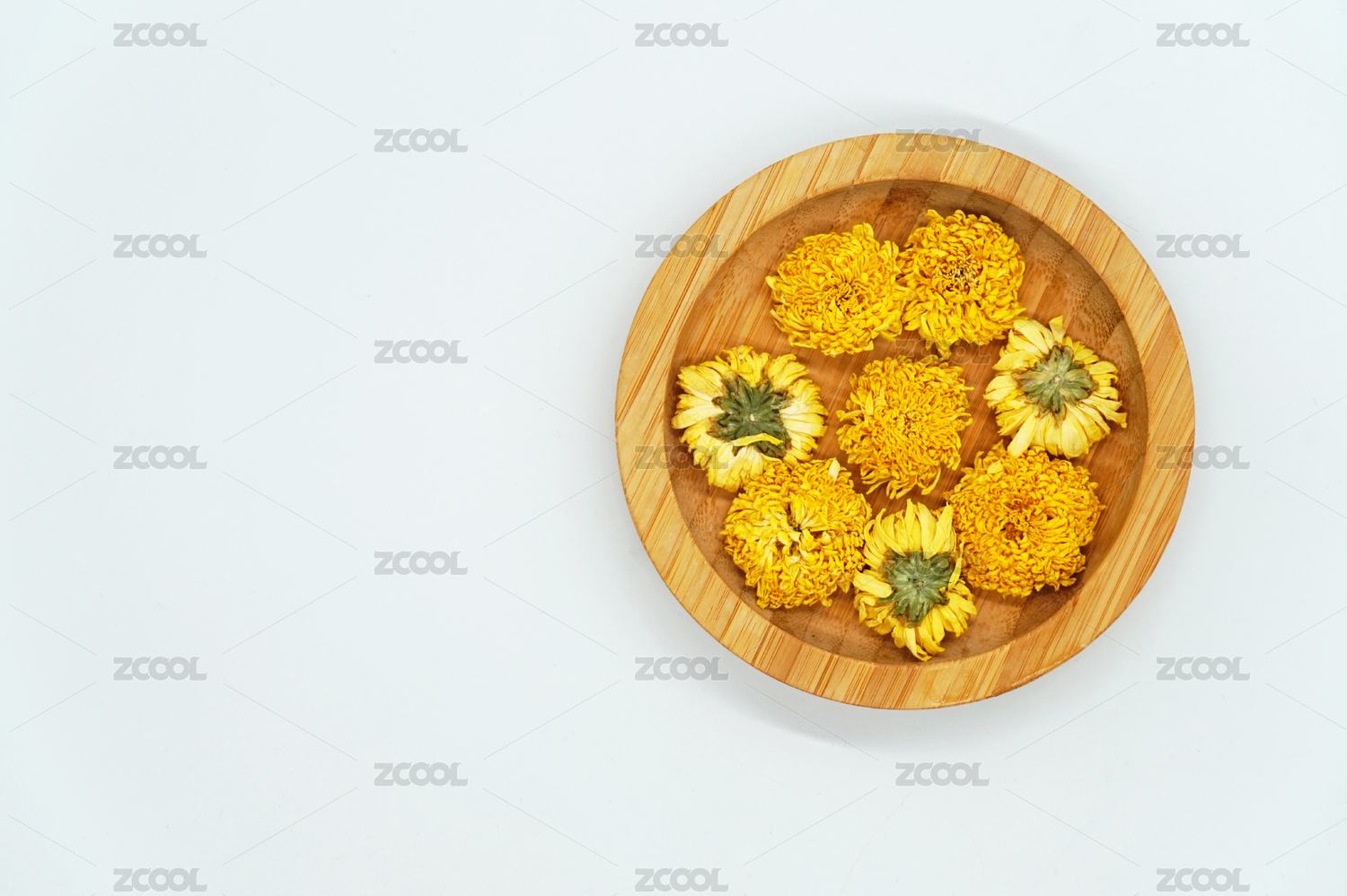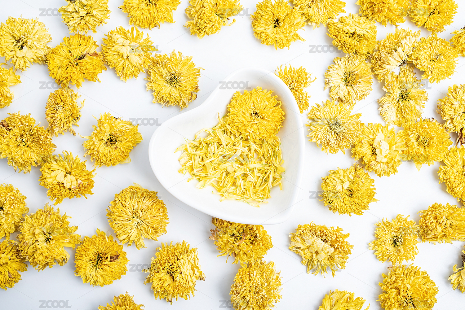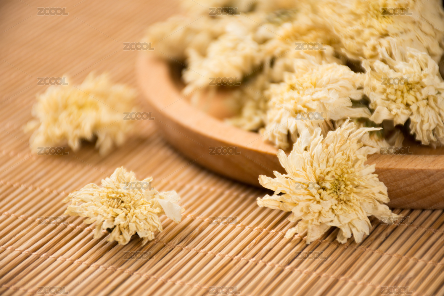 中国古典风格的杭白菊健康花茶与茶杯特写