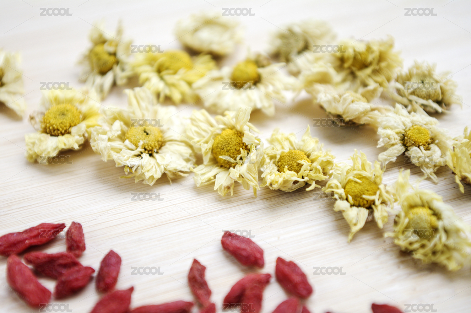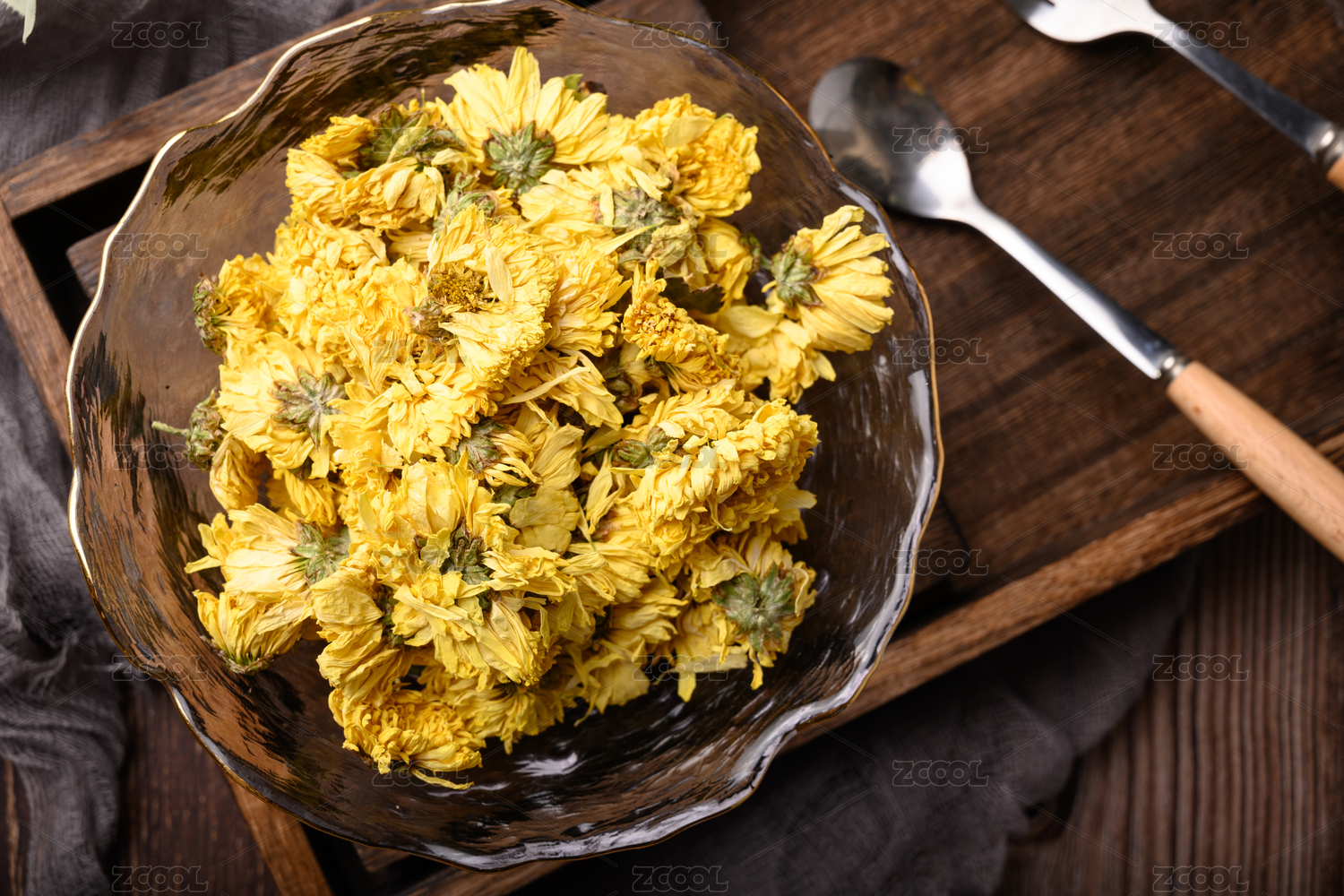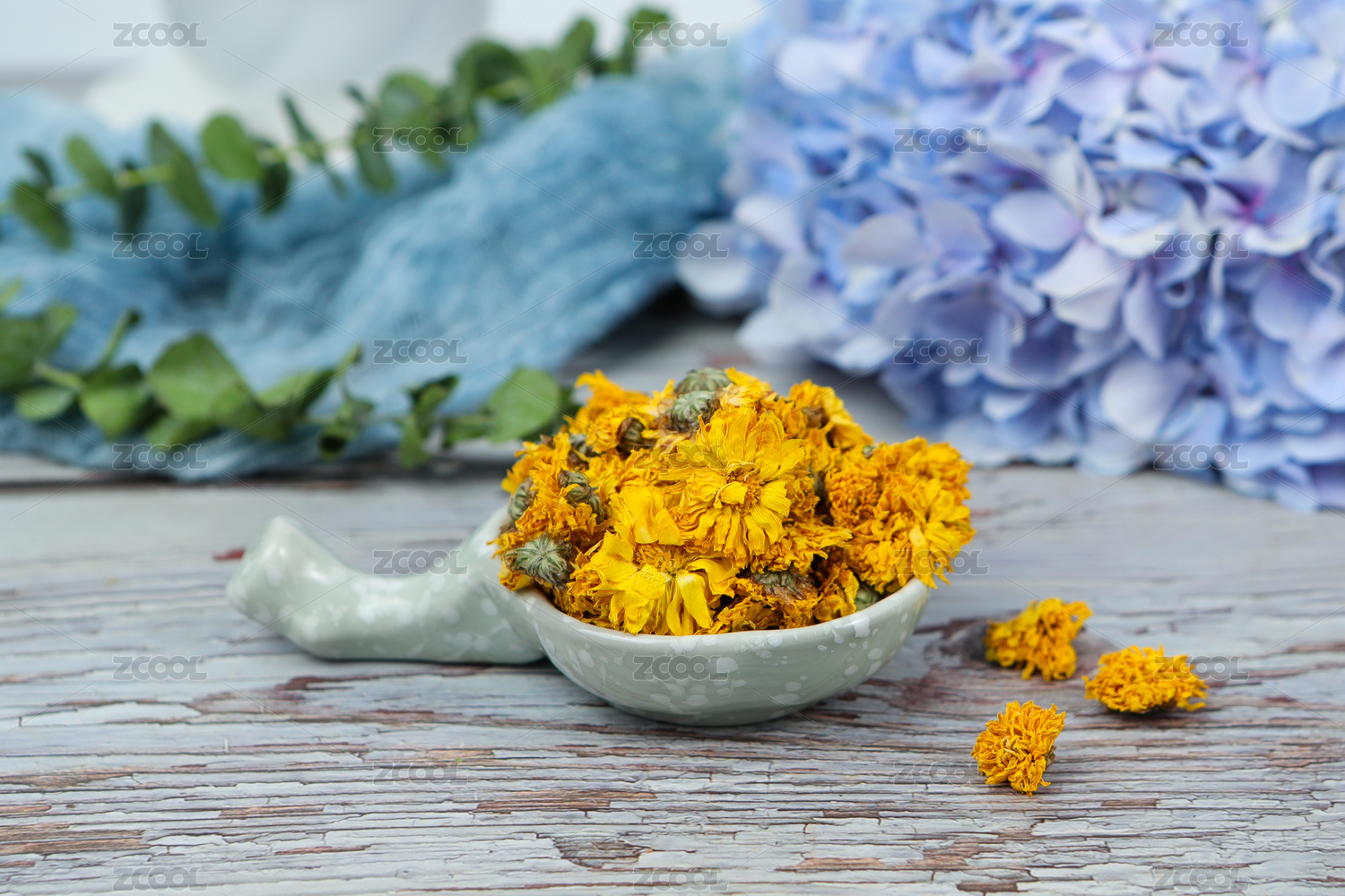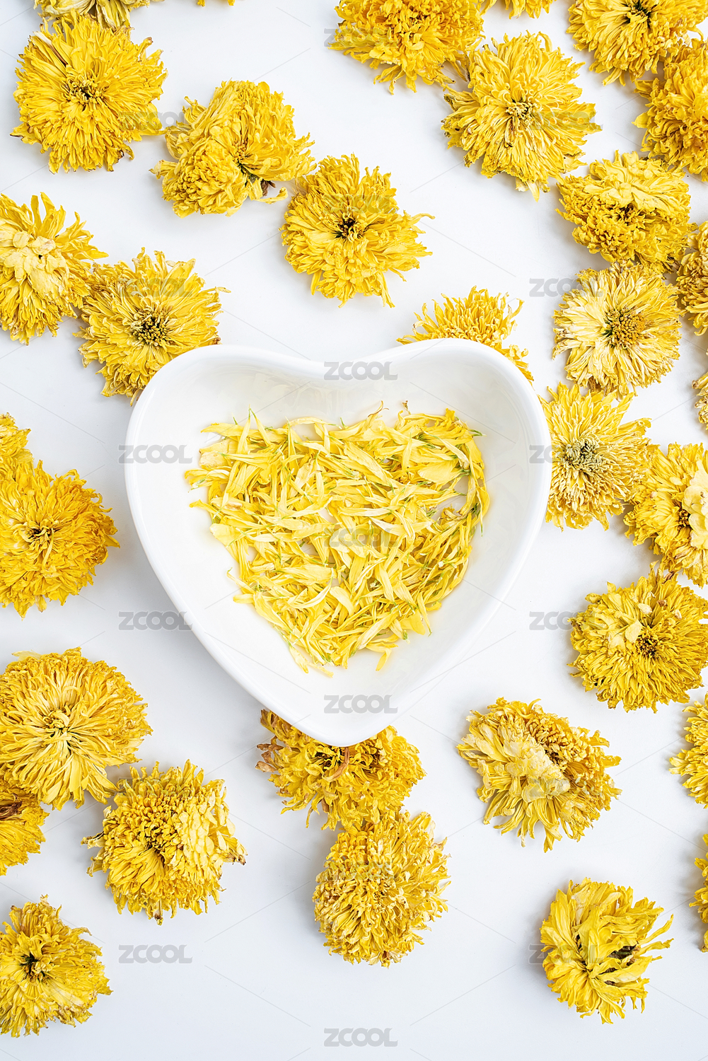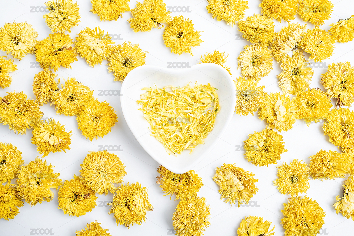 中国古典风格的杭白菊健康花茶与茶杯特写