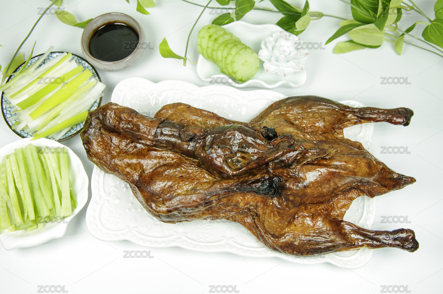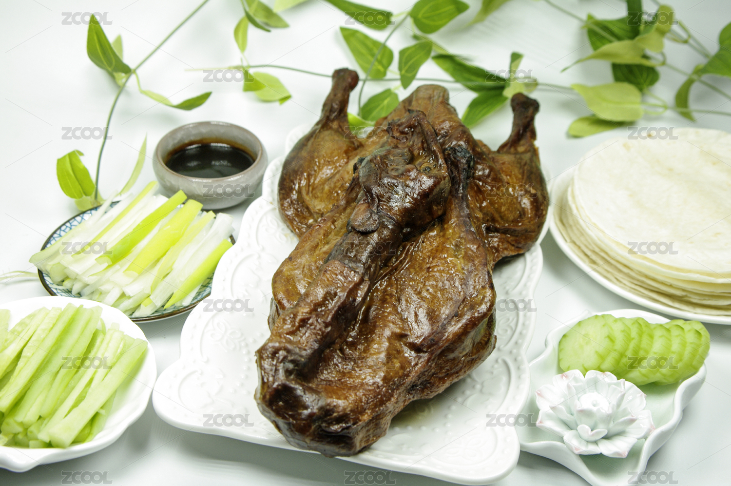 北京烤鸭,烤鸭,北京,北京填鸭,肉食鸭,北京鸭,葱丝,黄瓜条,甜面酱,菜肴