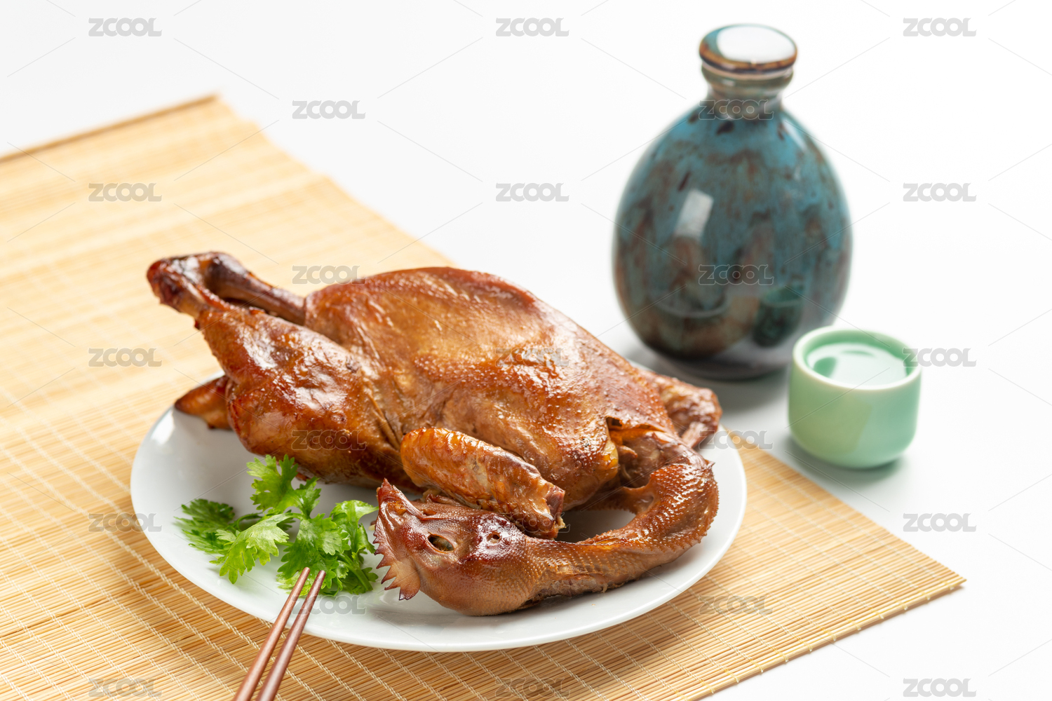 一盘整只的烧鸡和酒杯酒壶摆放在白色背景上