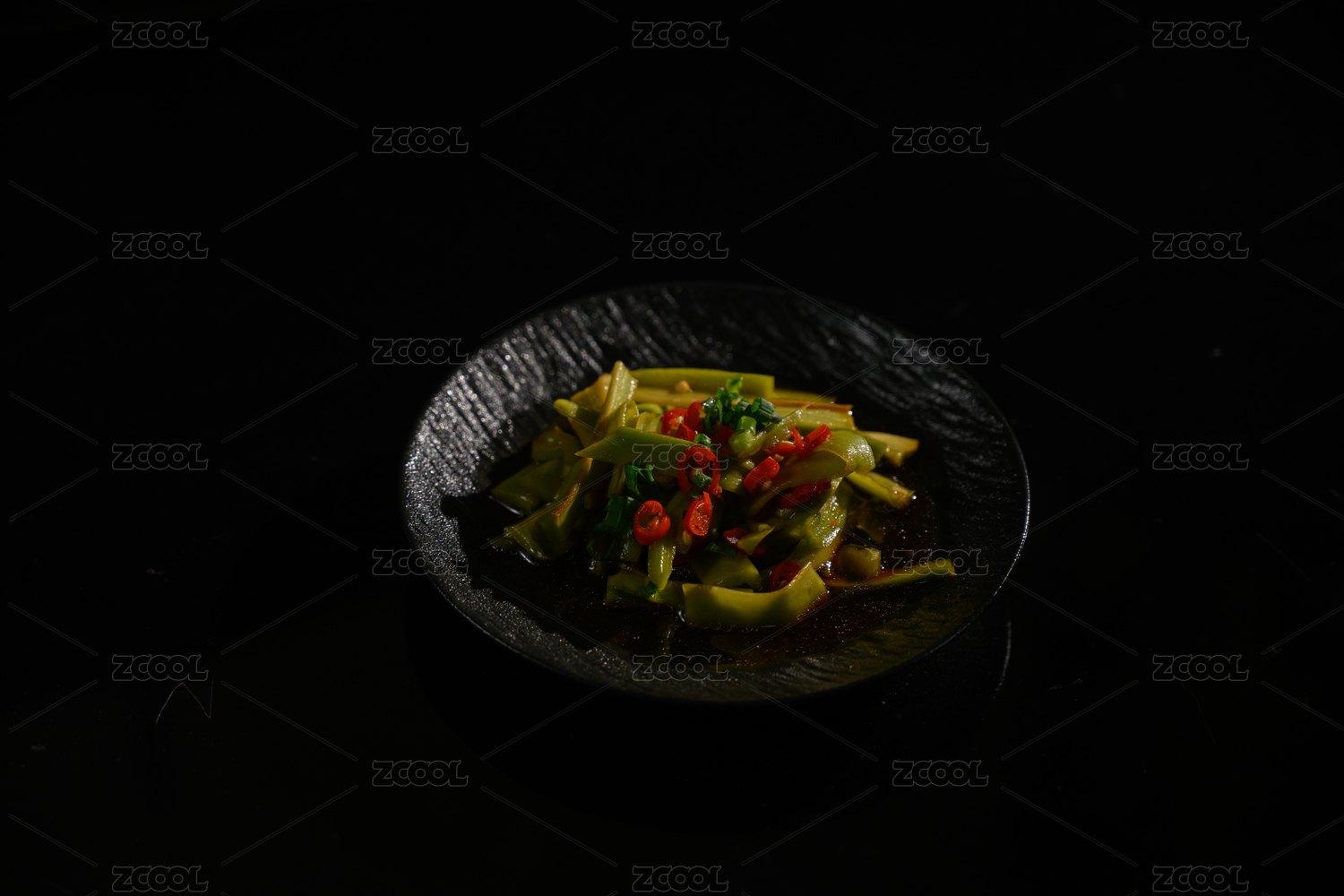 桌面上的盘子里的美味可口的凉拌青椒圈
