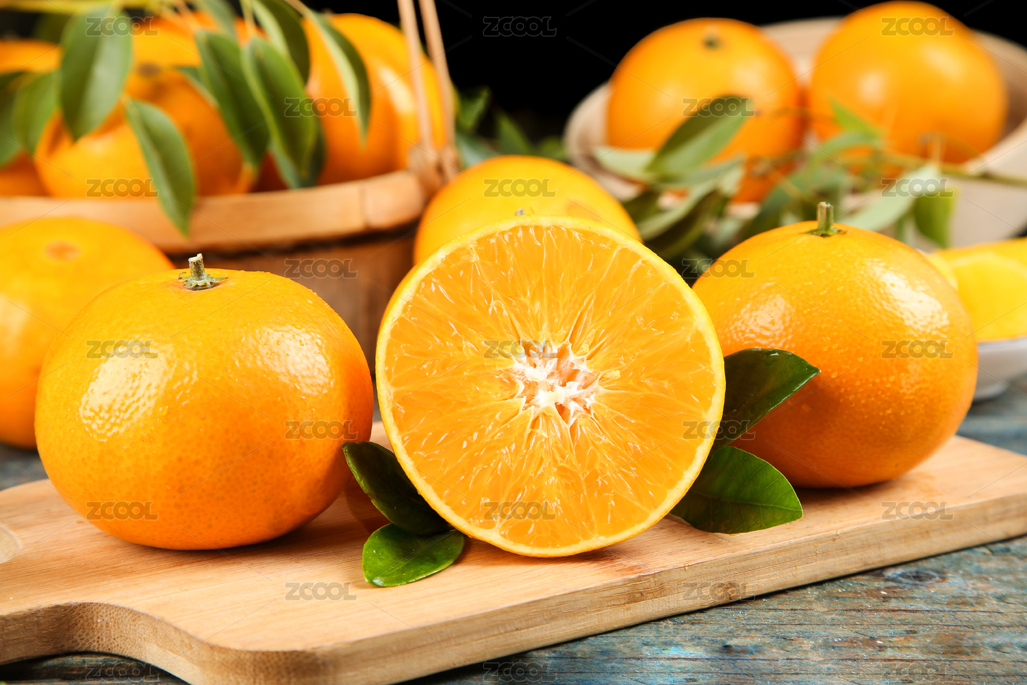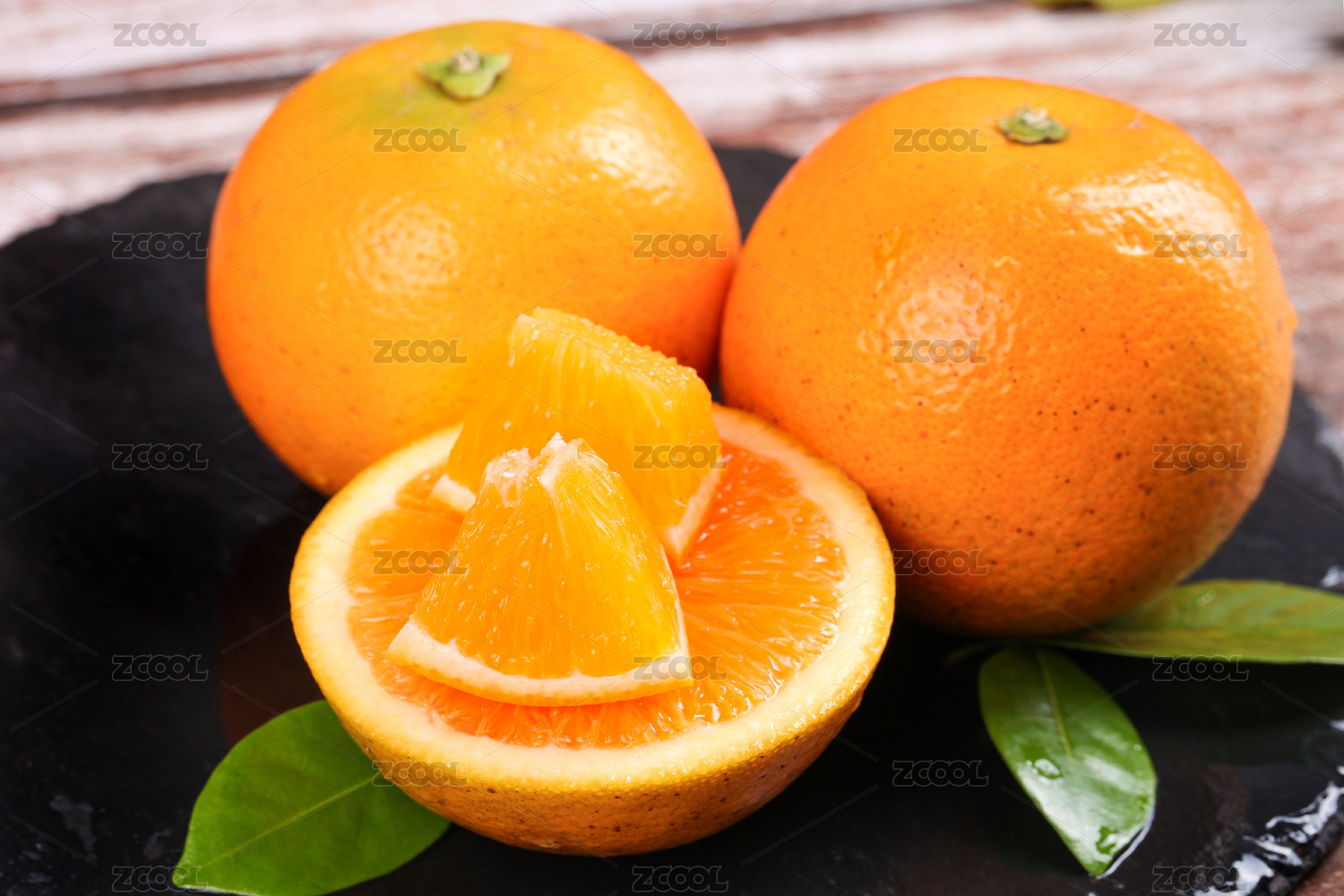 黑石板上放着一堆湖南麻阳冰糖橙和切块橙子