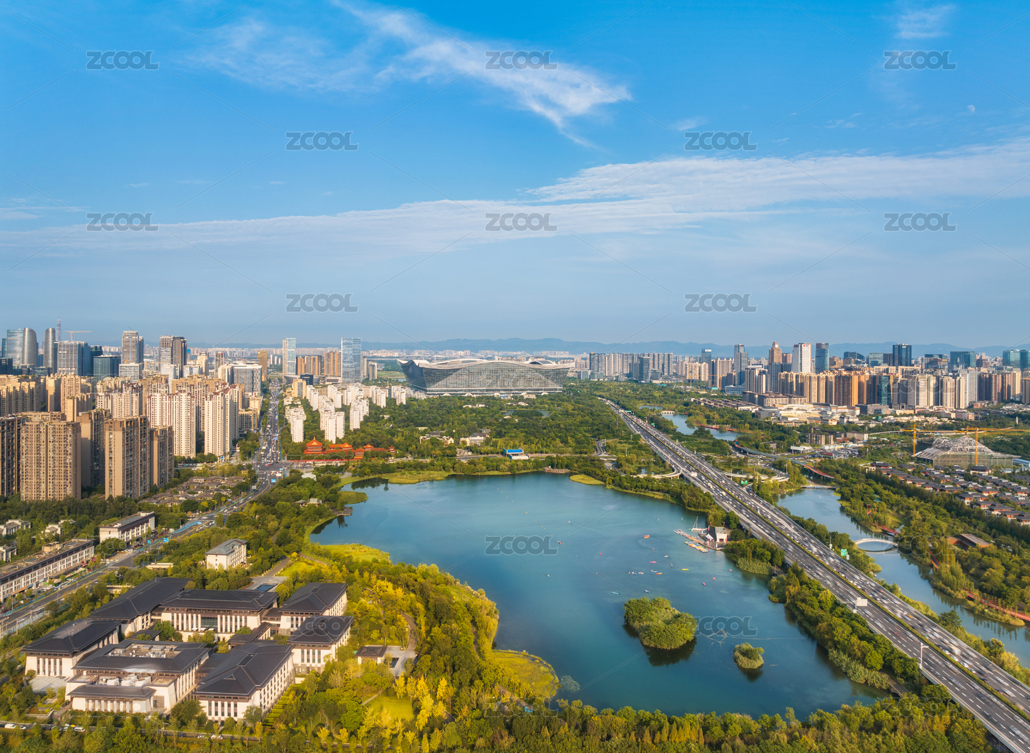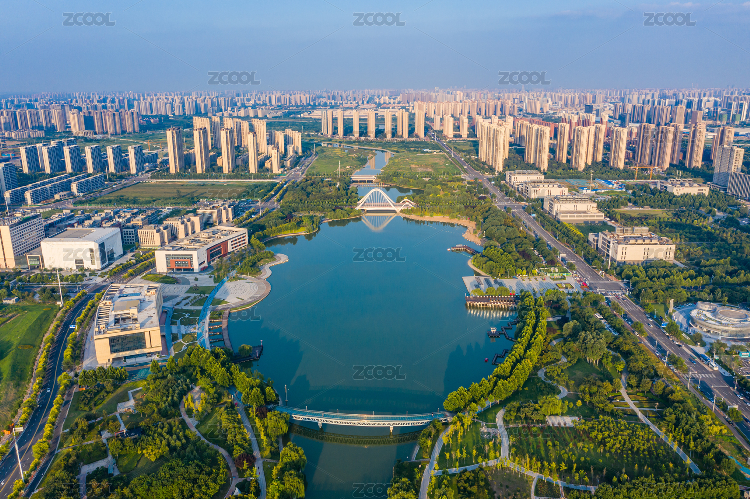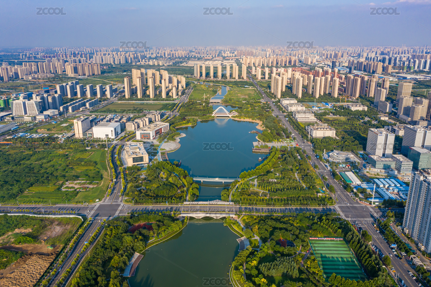 航拍郑州高新区天健湖公园城市湿地湖泊水系