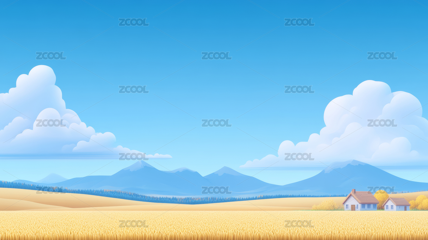 秋天金色田园风光与蓝色天空卡通插画背景