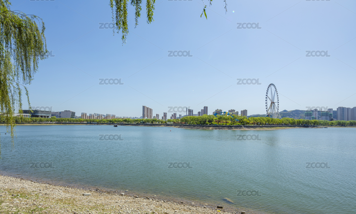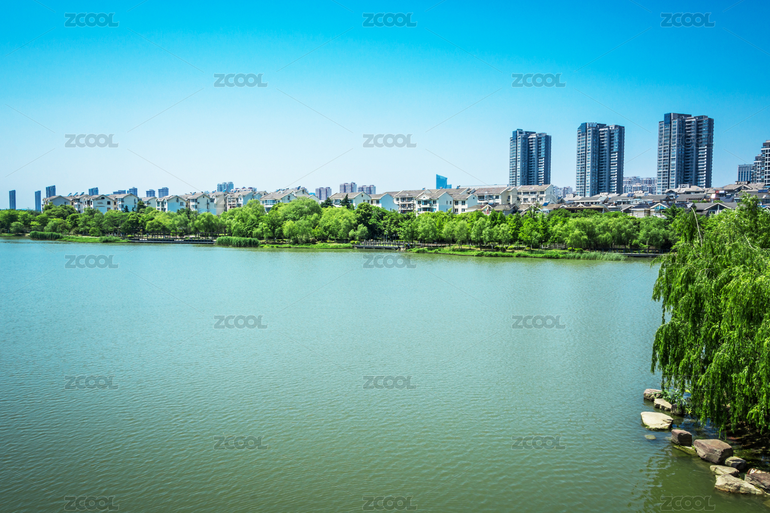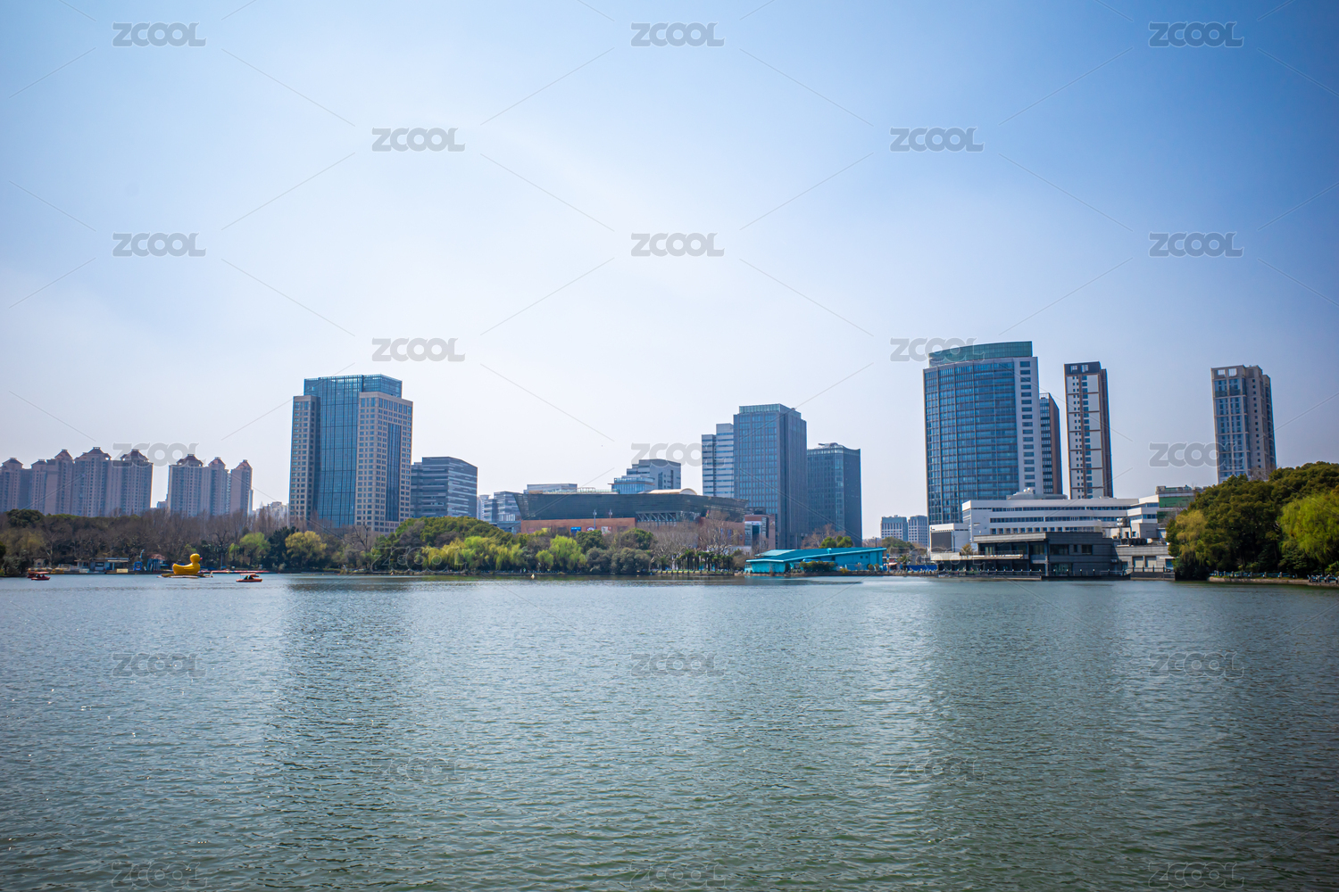 空旷的中国无锡蠡湖和现代城市建筑天际线