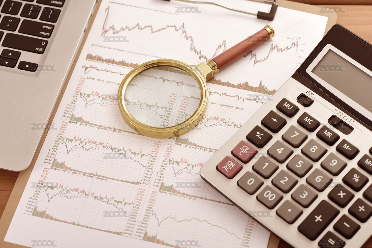 股市图表上摆放着放大镜和计算器