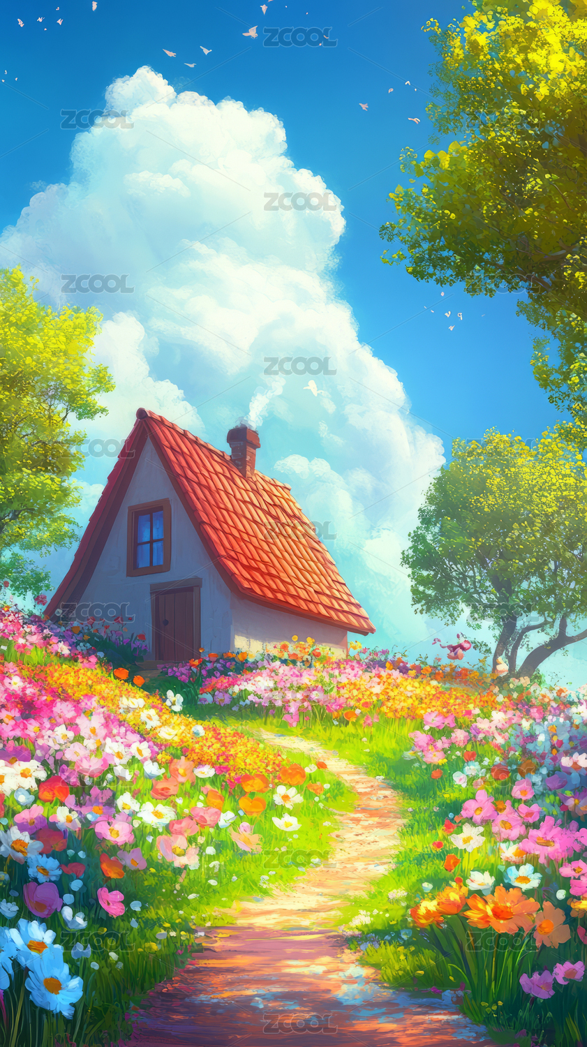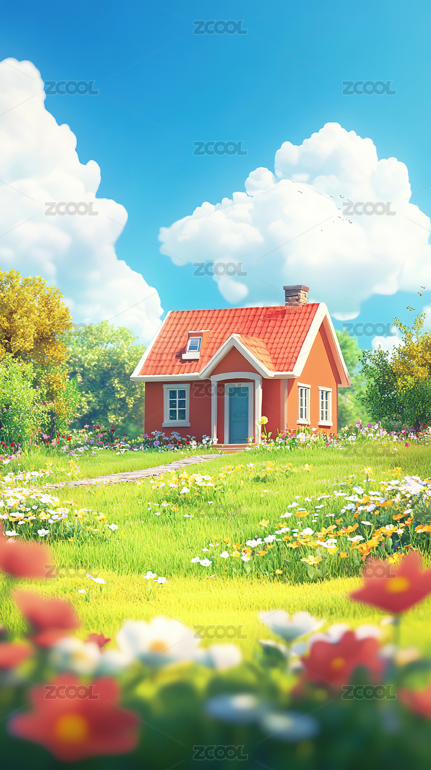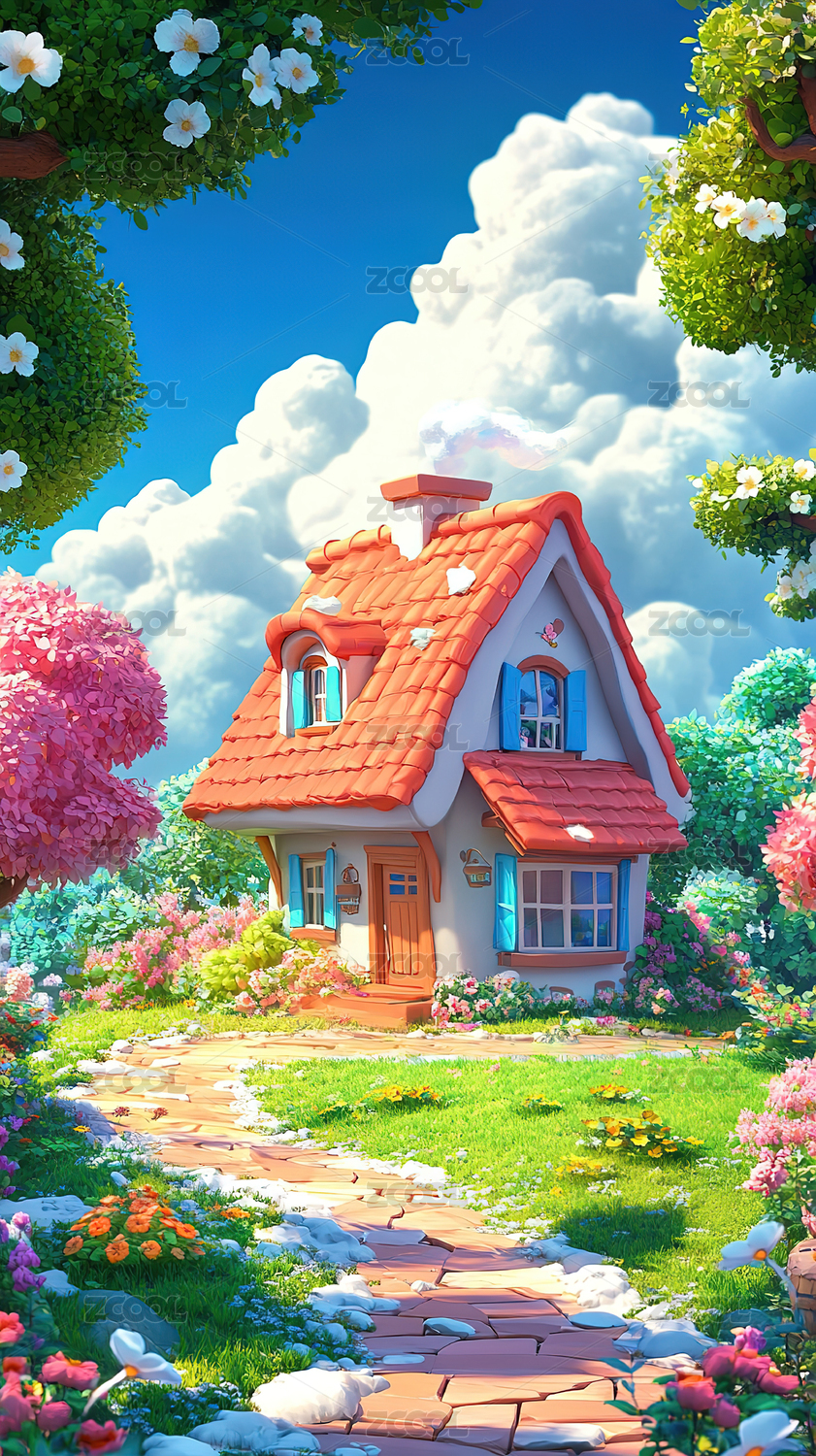 卡通,草地,房子,花朵,背景,壁纸,手机,电脑,桌面,卡通壁纸