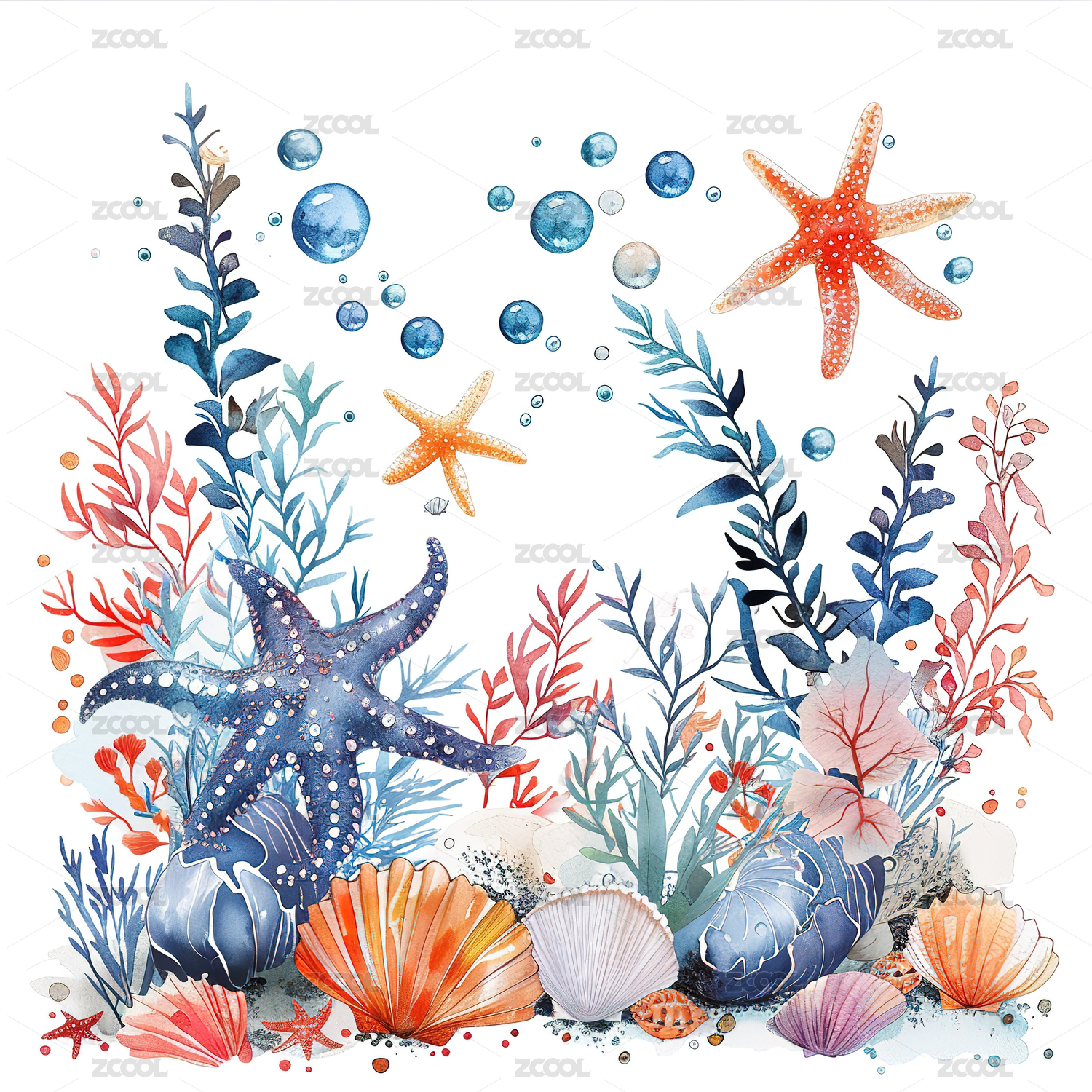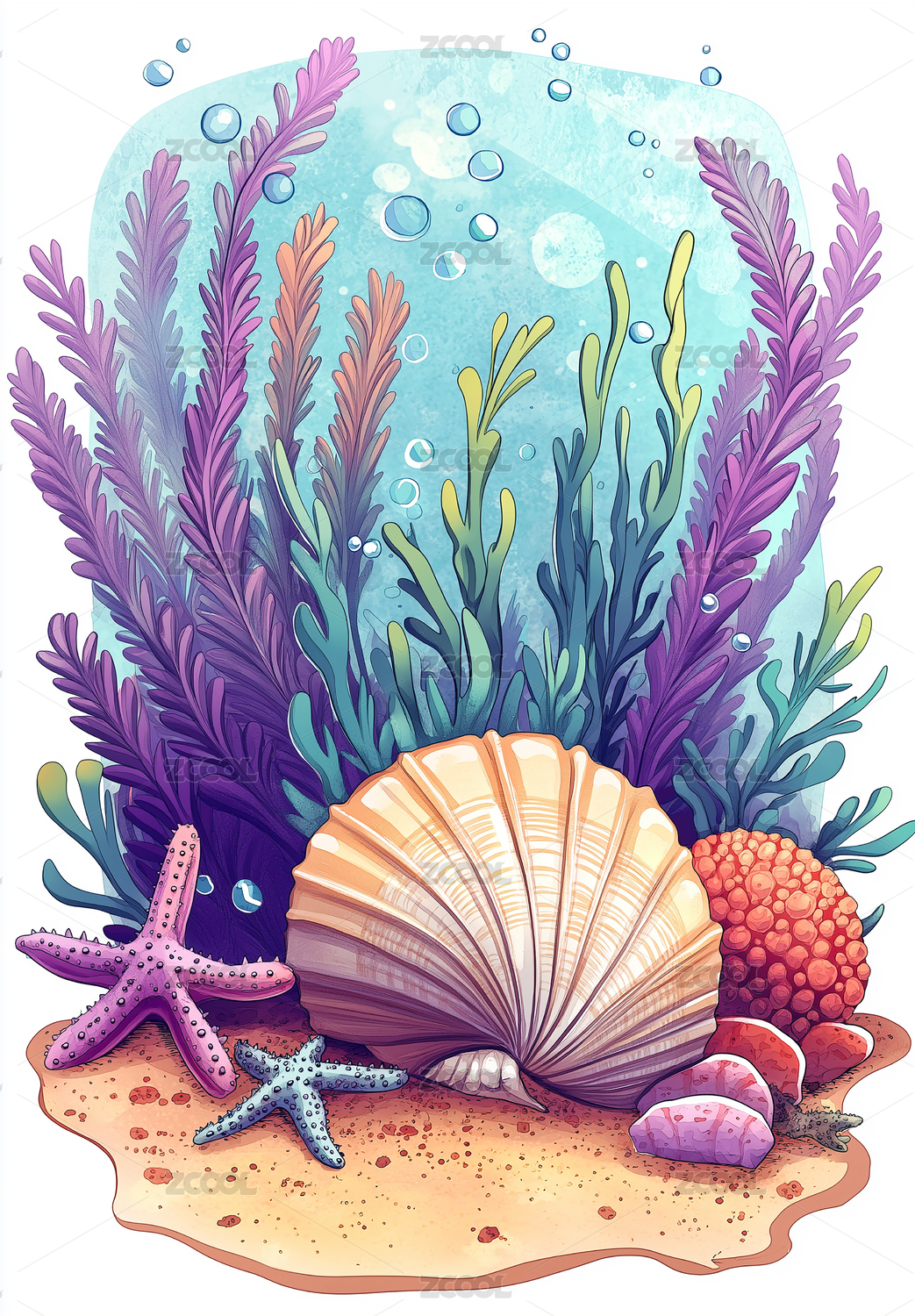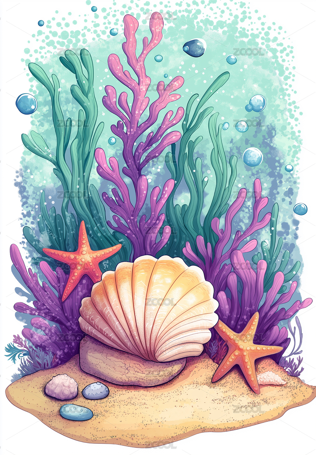珊瑚,贝壳,海底,海草,海星,插画,背景,白色,海洋,礁石