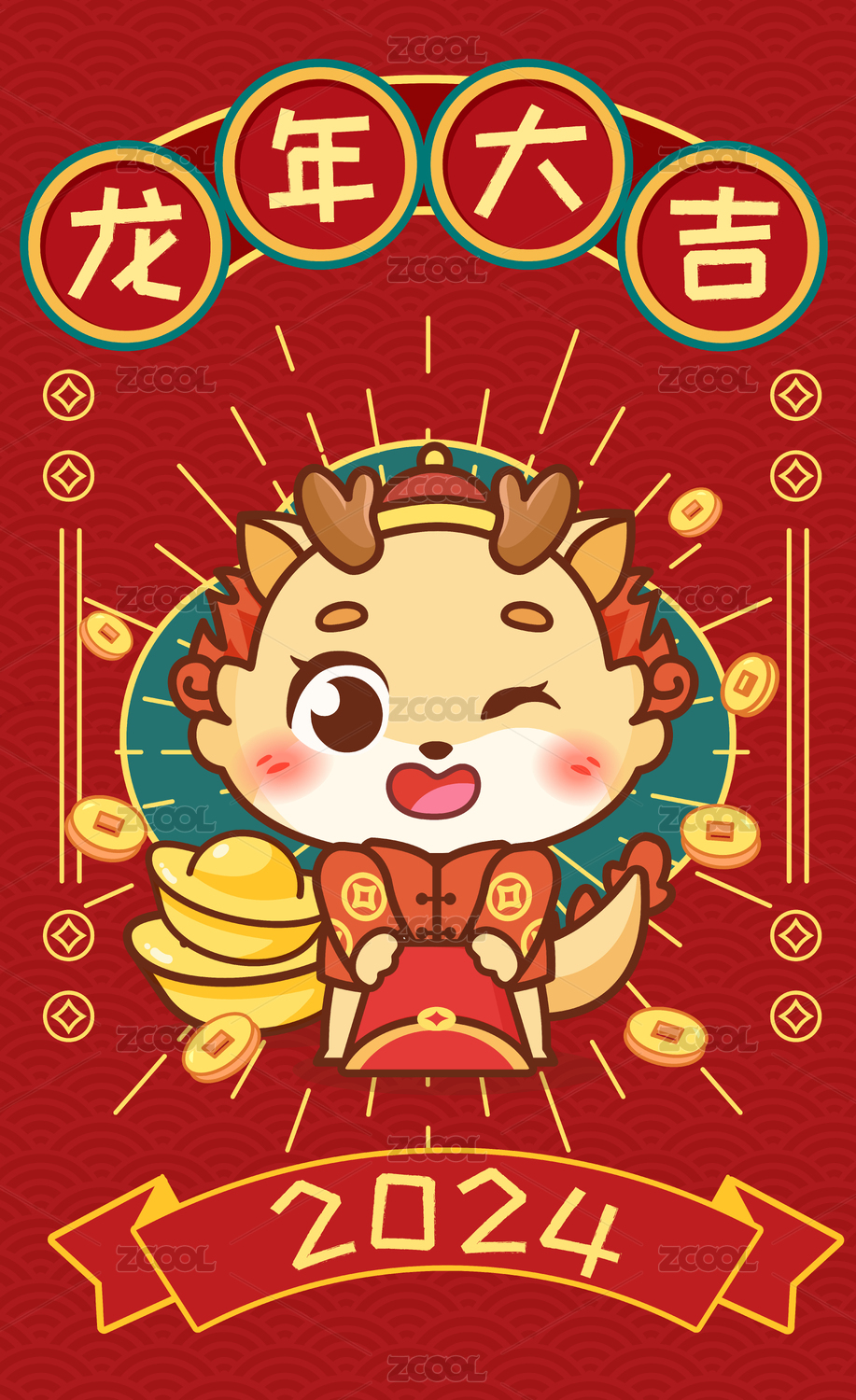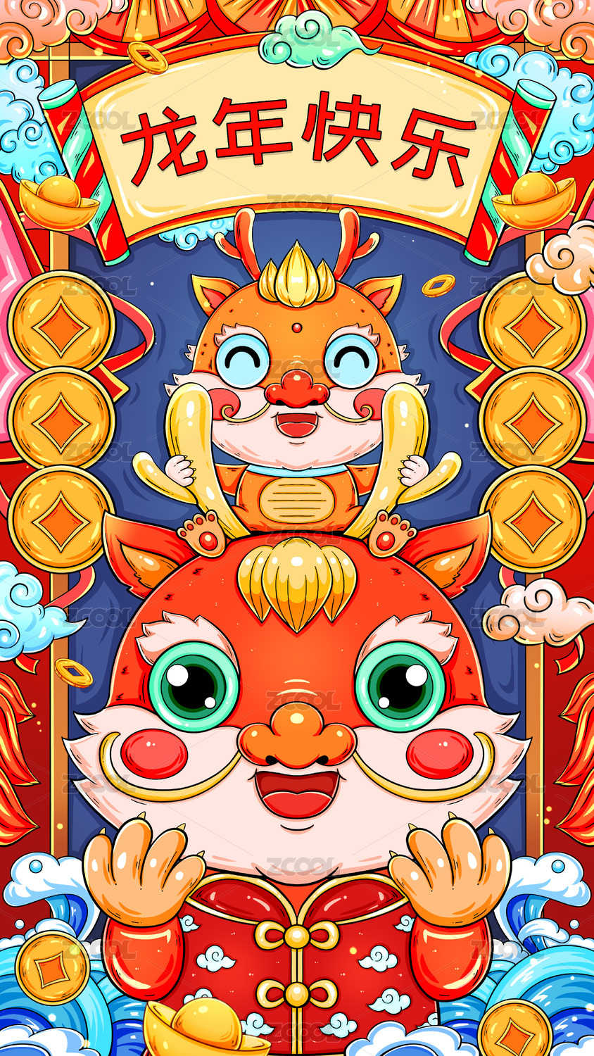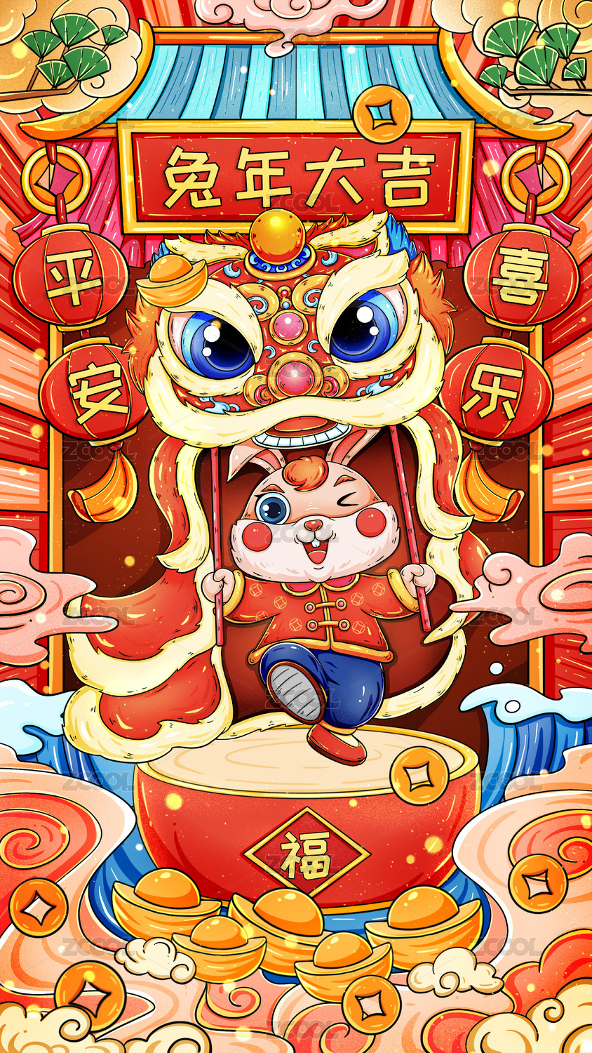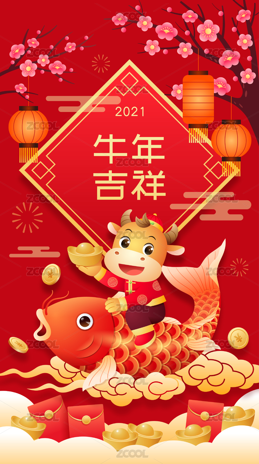 新年牛骑鲤鱼和梅花灯笼等插画竖版