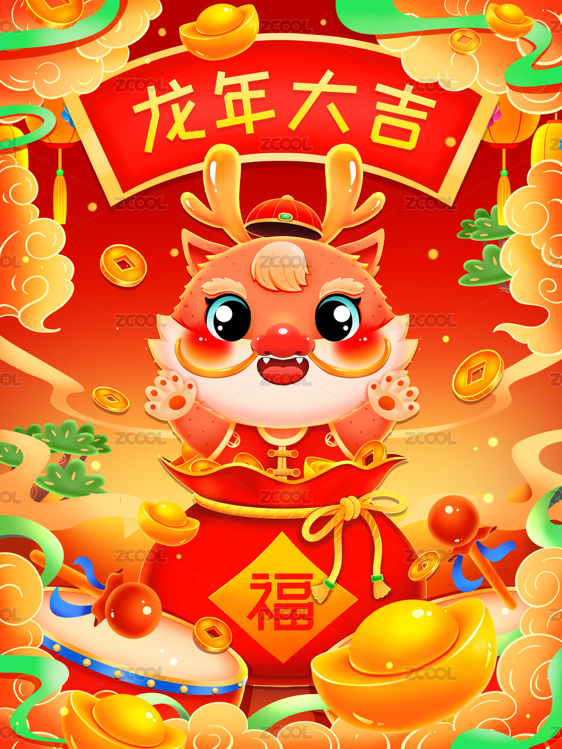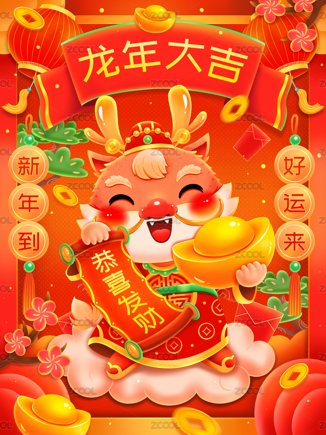 新年牛骑鲤鱼和灯笼梅花等插画竖版