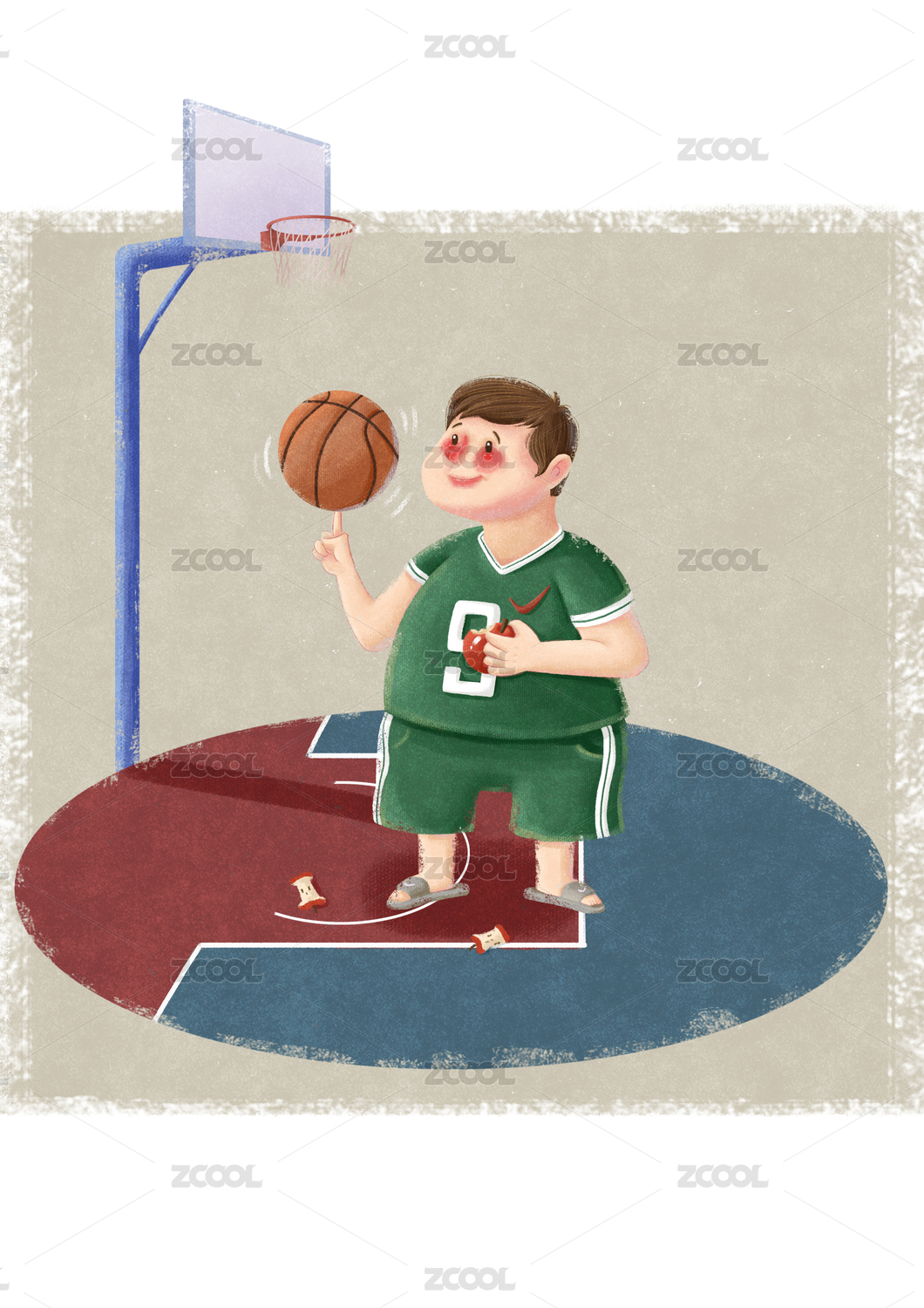 吃苹果打篮球运动的胖男孩