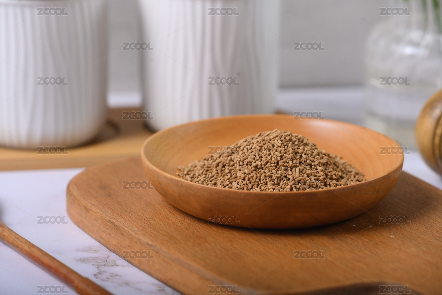 放在木纹背景上木盘里的白芝麻
