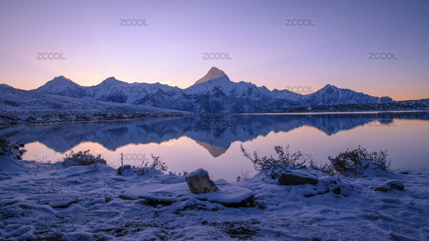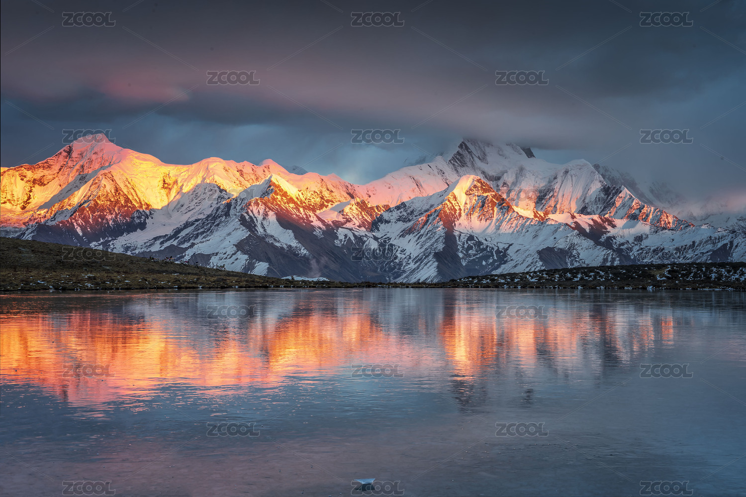积雪覆盖的中国贡嘎雪山,与结冰的蓝色湖面
