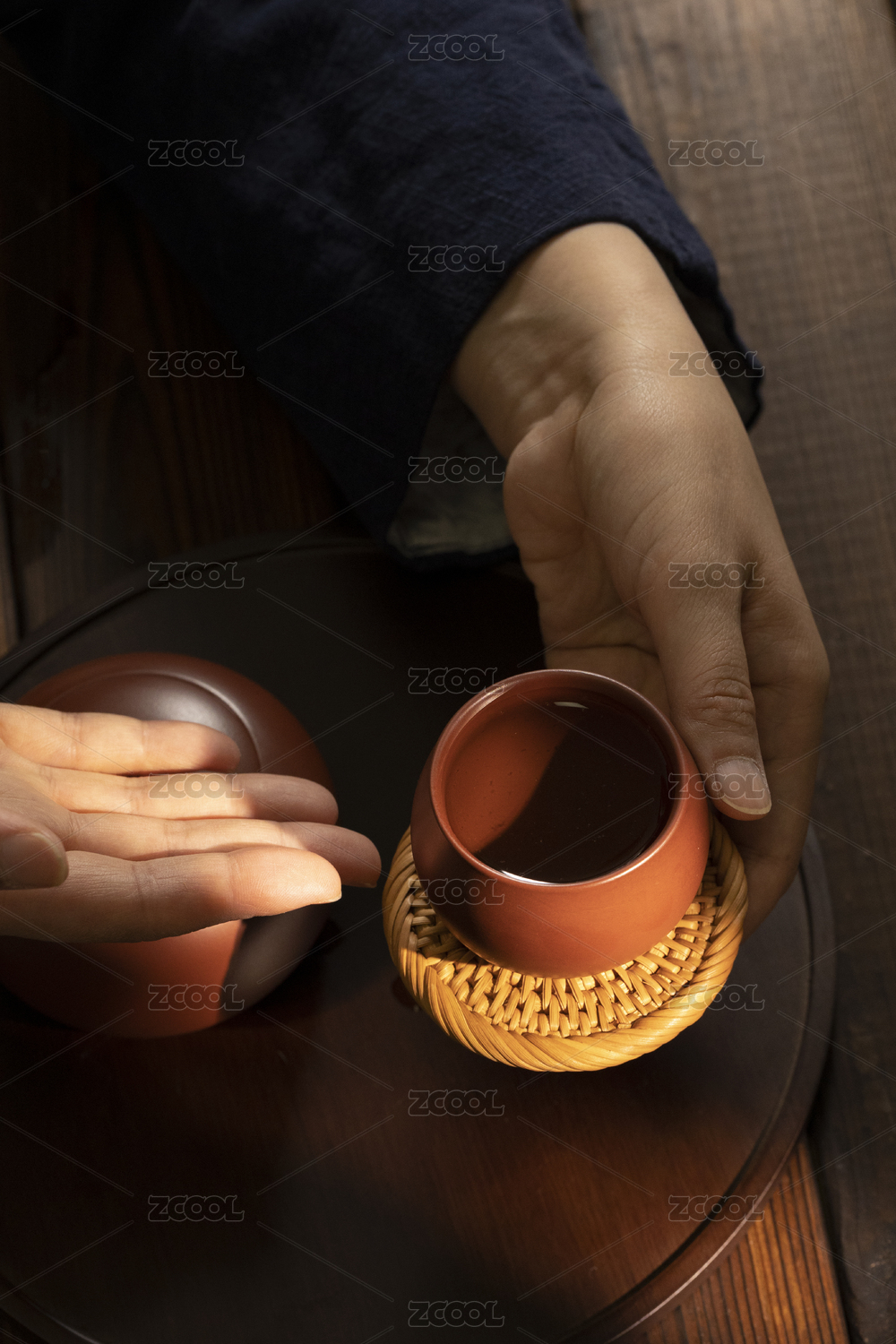 手拿朱泥紫砂壶往朱泥紫砂杯里倒茶水