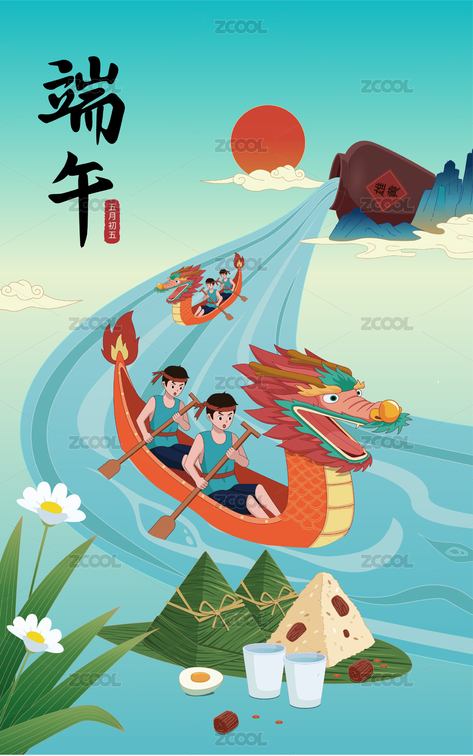 端午节赛龙舟传统节日活动粽子美食国潮插画