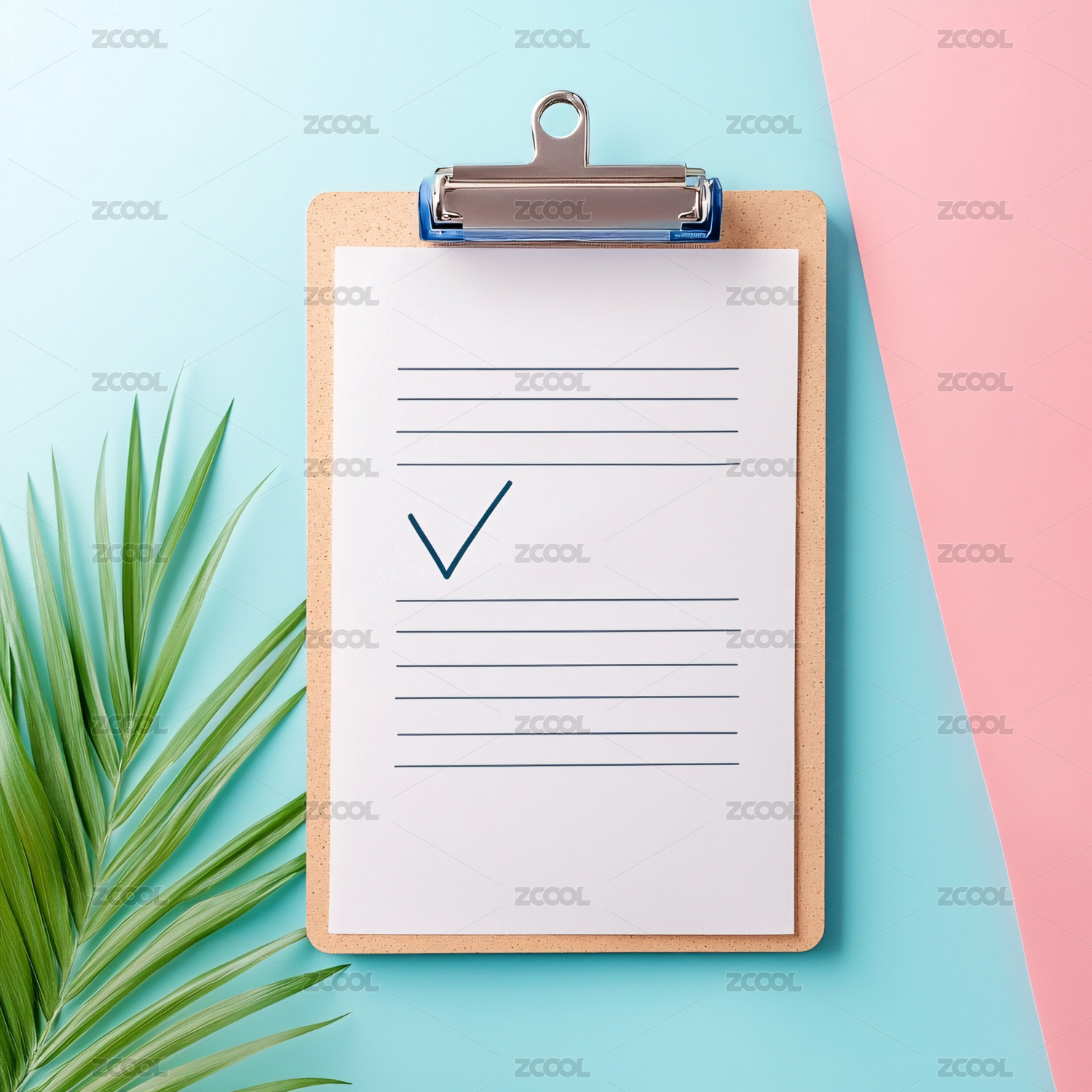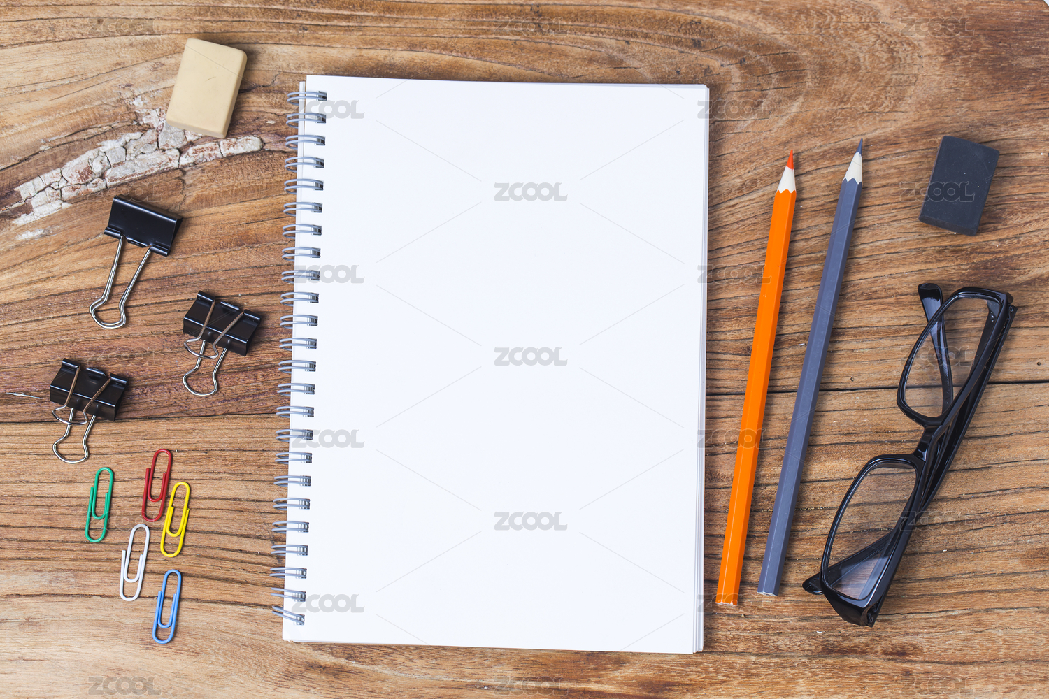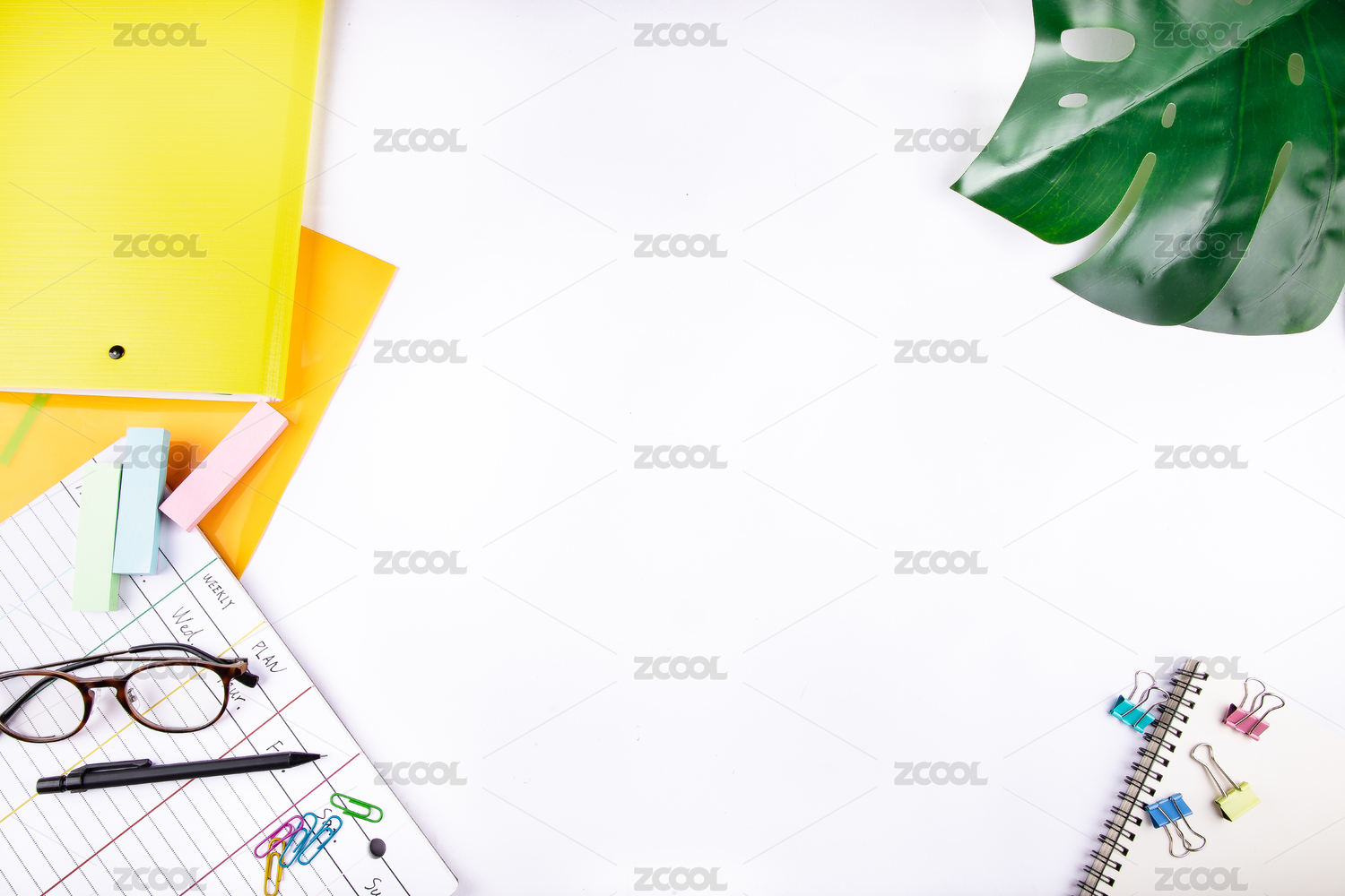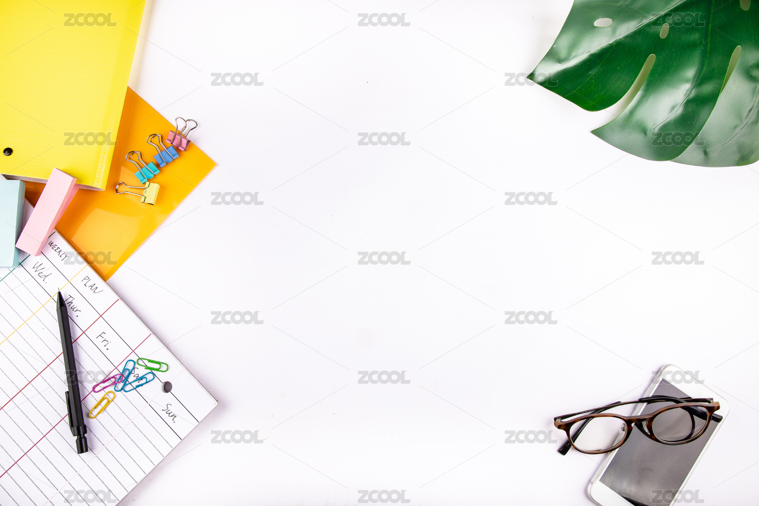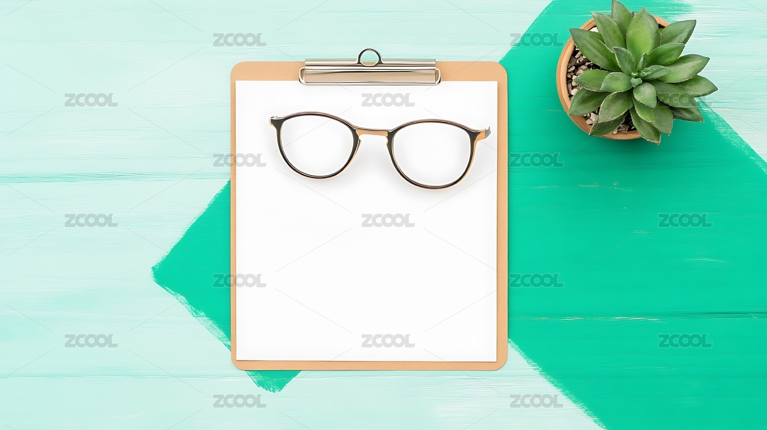 正上方视角特写放在办公桌上的各种办公用品,眼镜和绿色植物