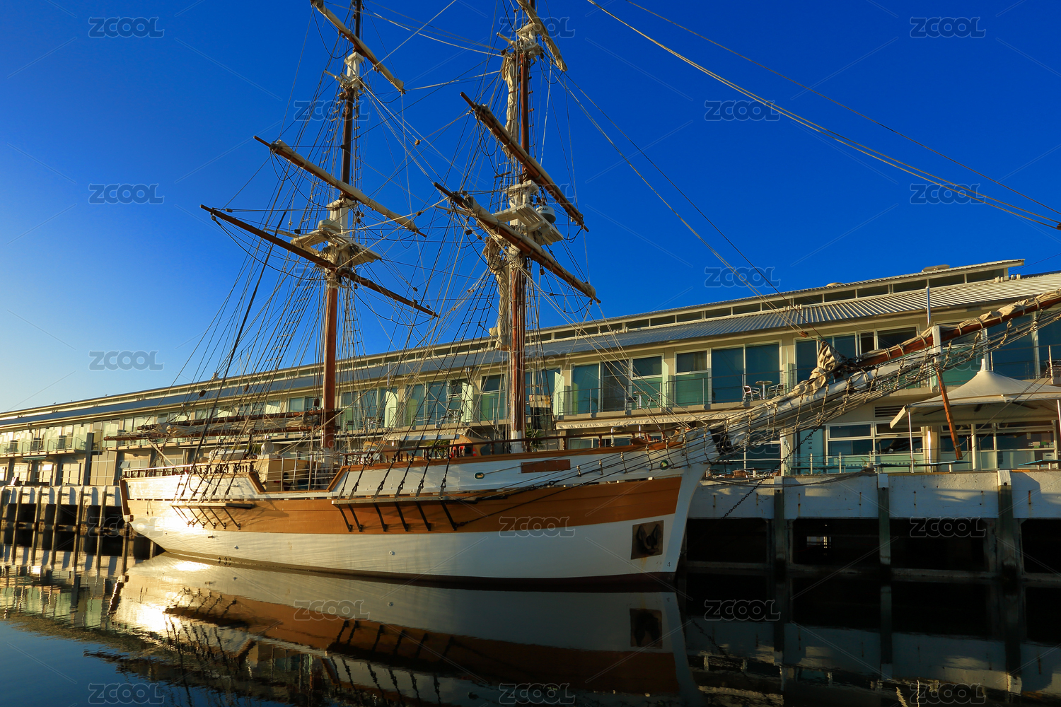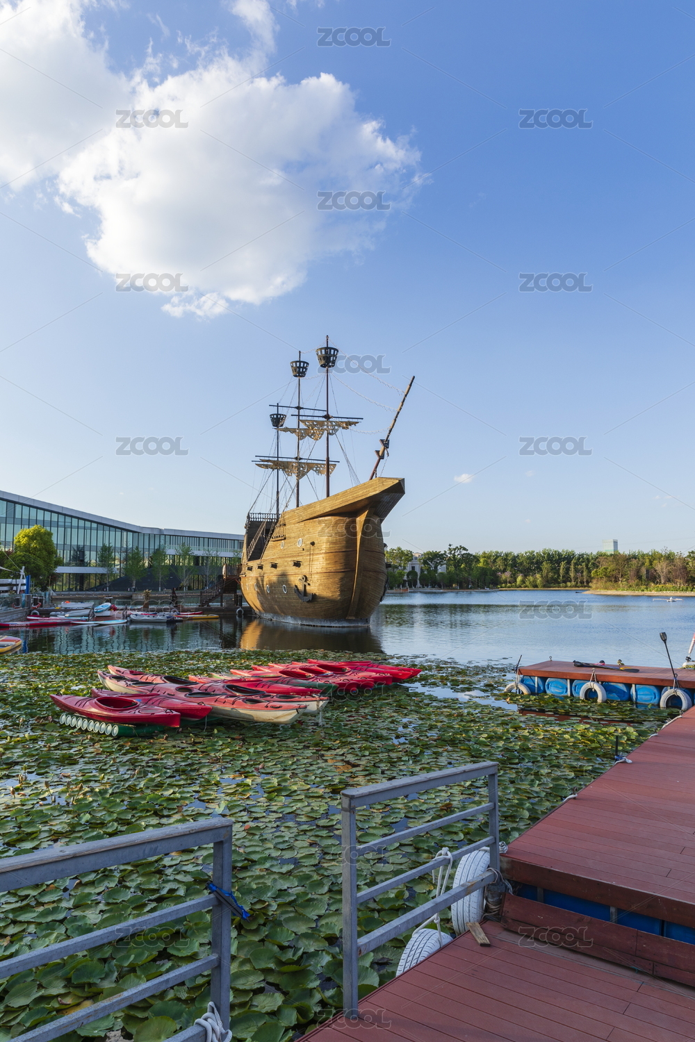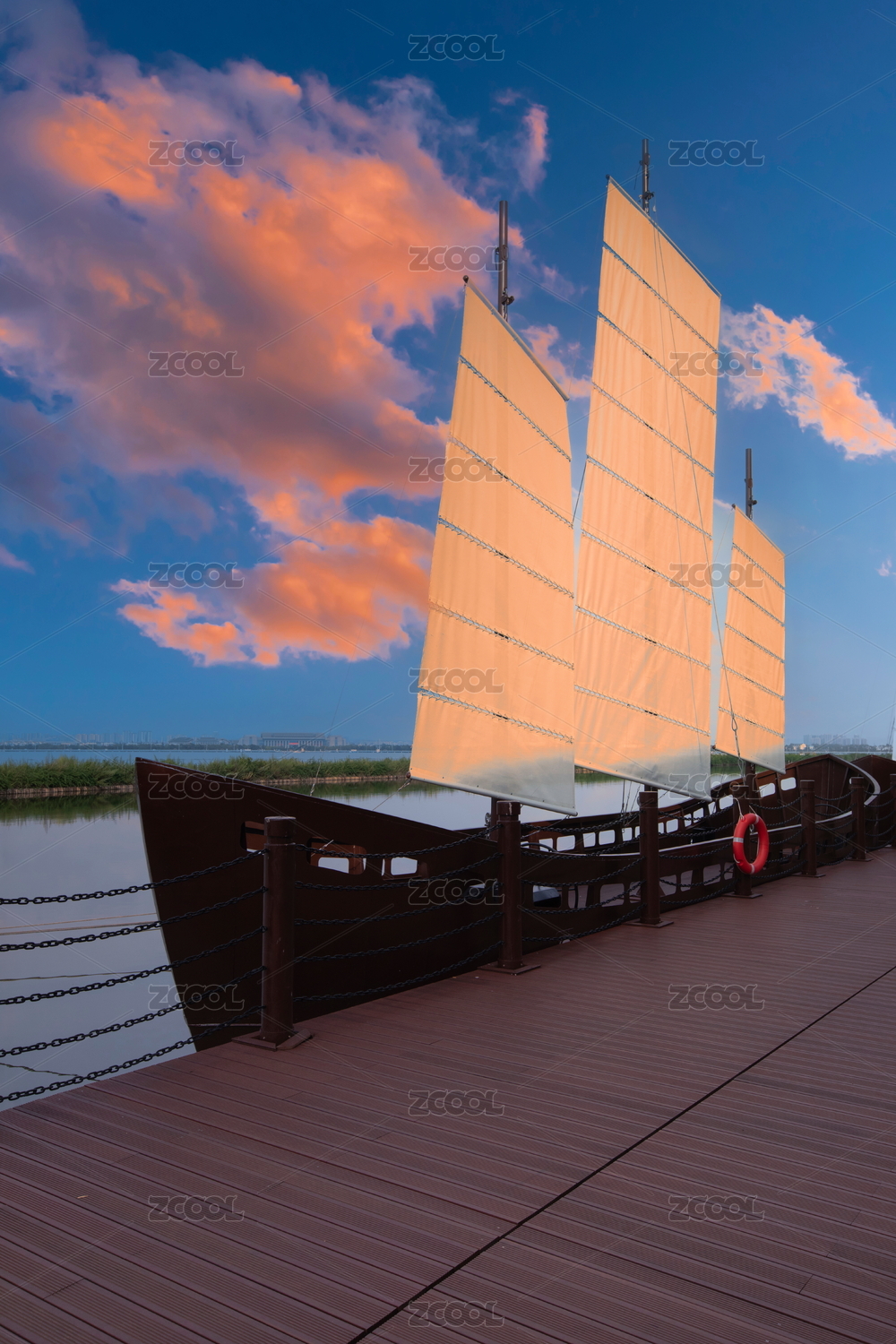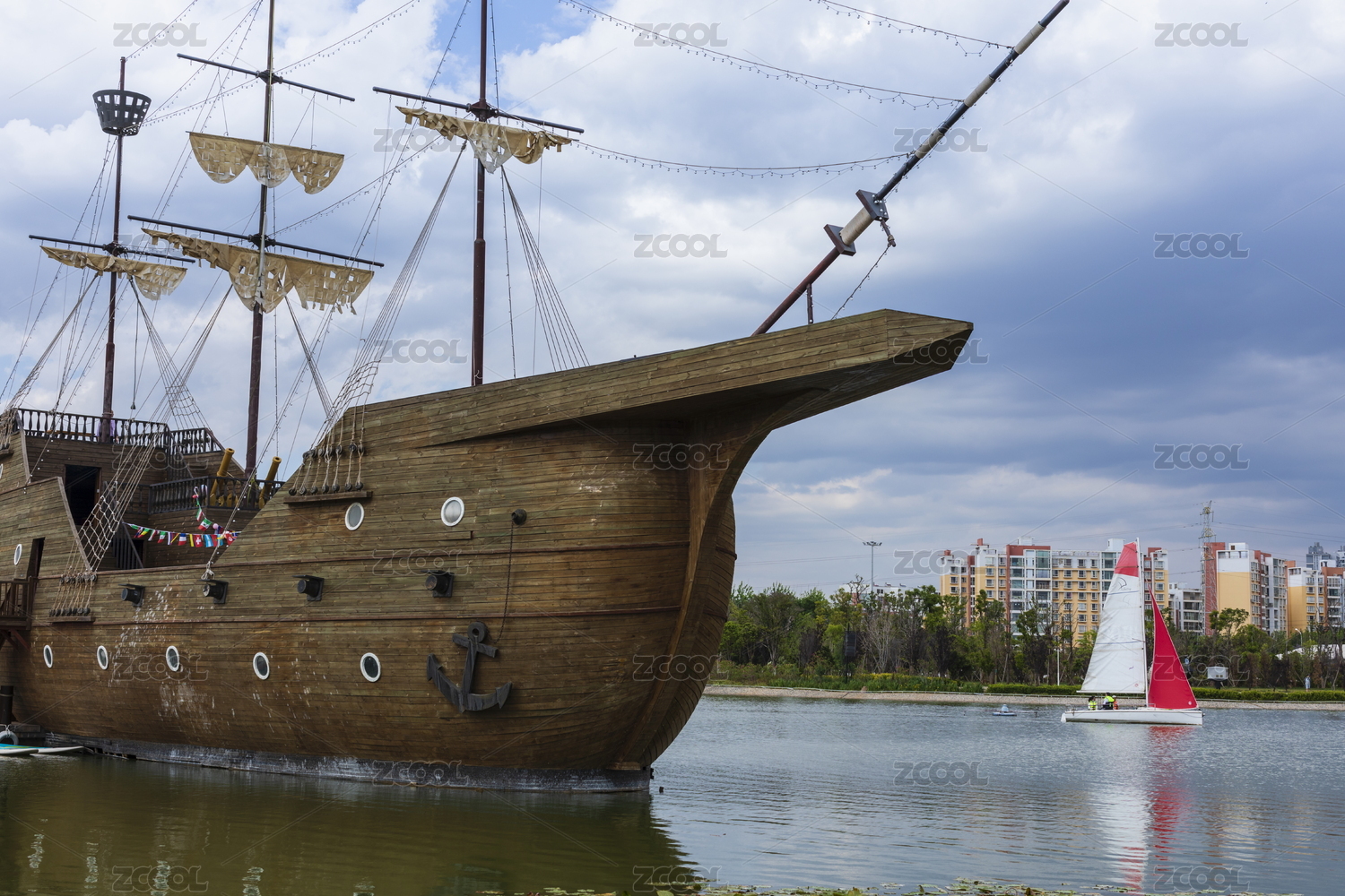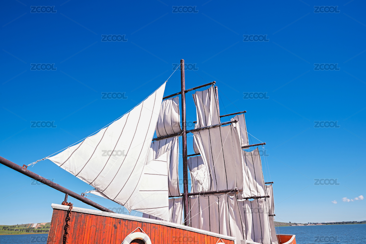 河北省沽源县库伦淖景区湖畔停靠的复古帆船